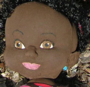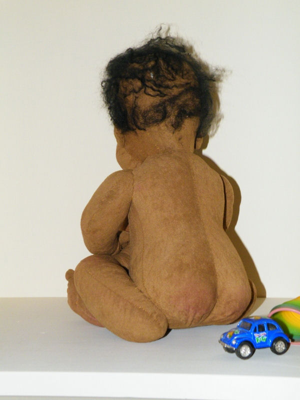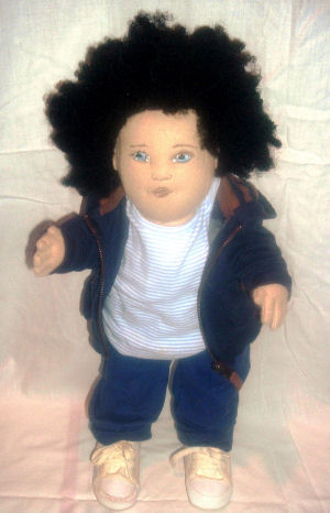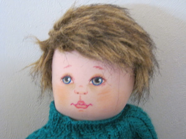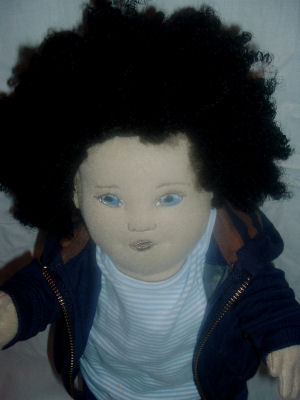 Bo is made from recycled velour (an American Indian costume), with Homespun yarn torn apart for hair and eyes painted using craft paints. He was originally meant to be a reproduction of a terra cotta sculpture that I saw back in the 1970s but morphed into an actual "child". Pattern used was Darlene Rausch's Bonnie pattern.