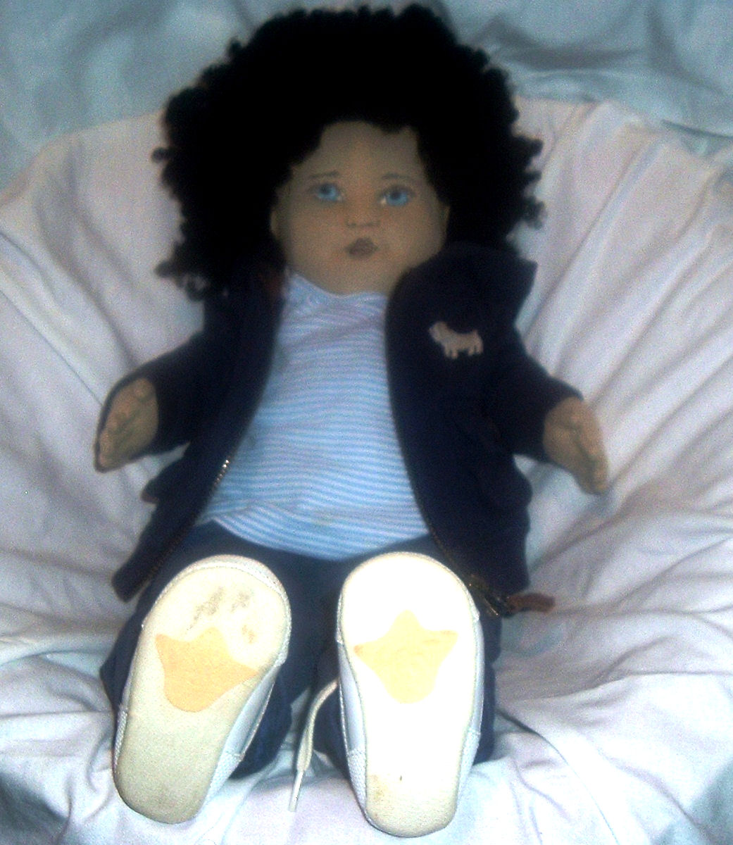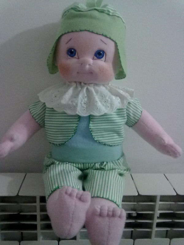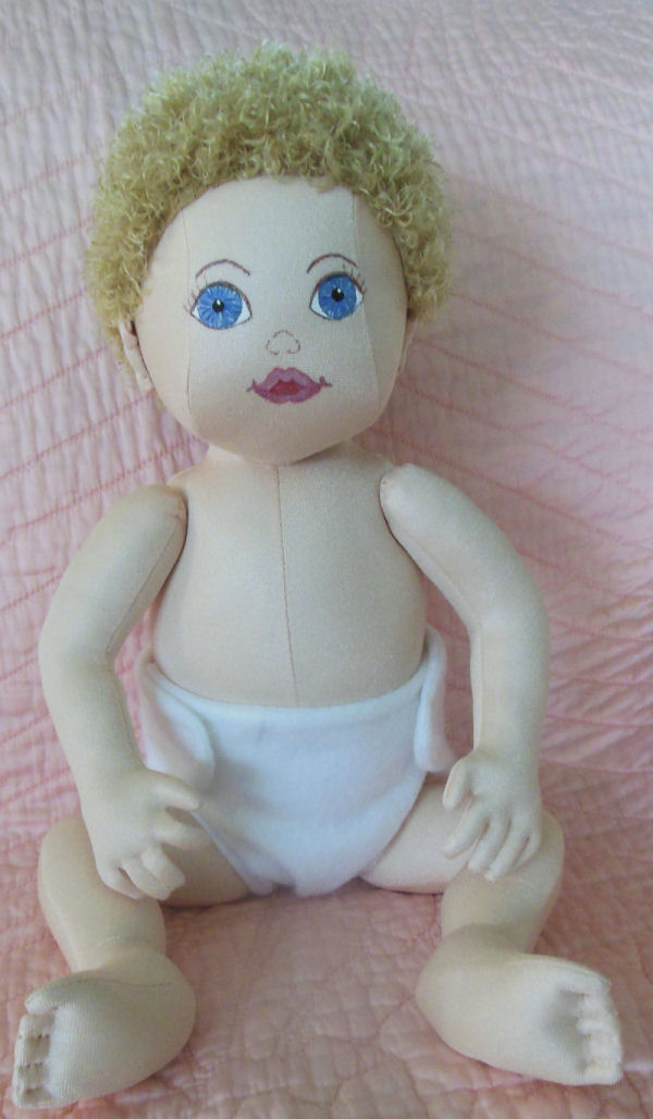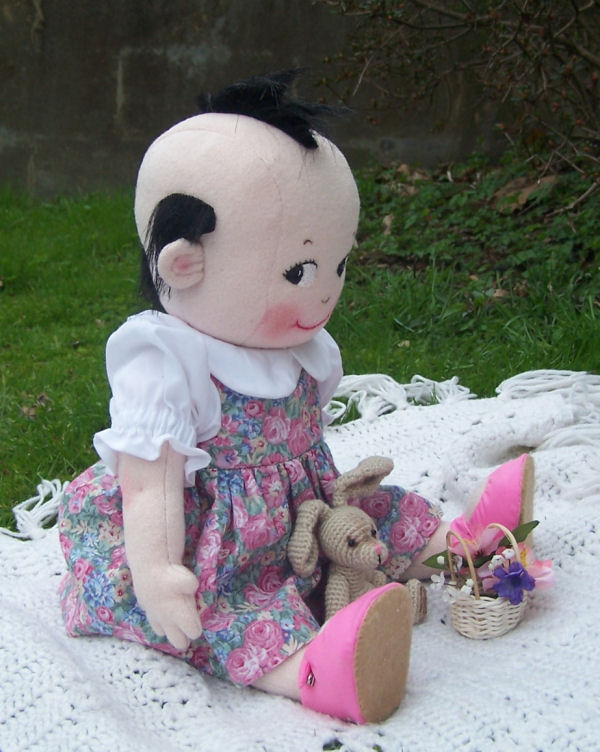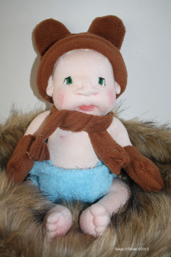 Adapted body pattern from Making Memories "The Material Baby" and adapted head pattern from Darlene Rausch pattern "Sue & Bill" Soft Dolls And Animals Magazine issue July 2012.