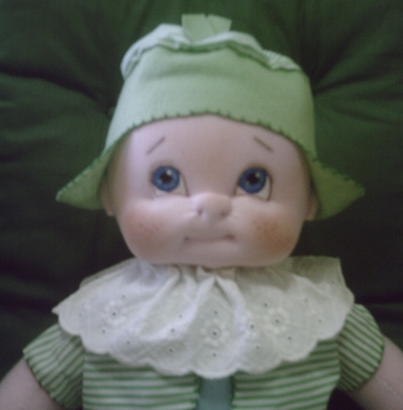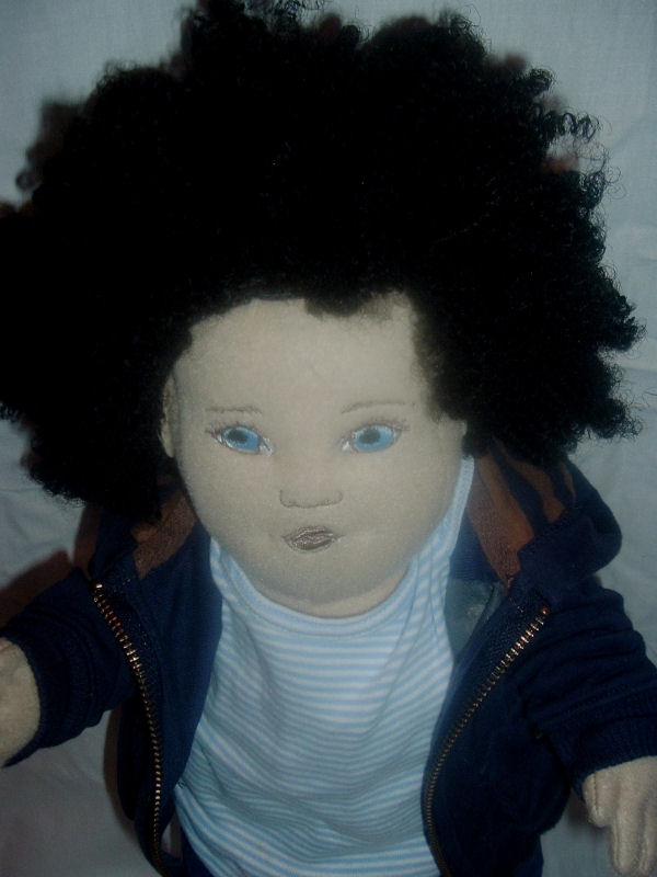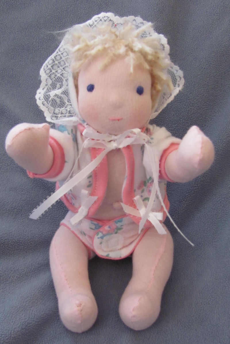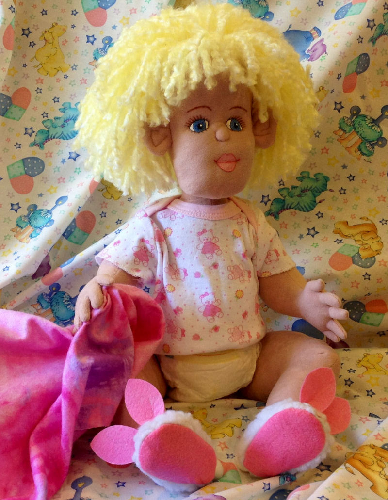 face. She is soft sculpture baby doll, made from polyester knit fabric. Her eyes and lips are painted with acrylic paints. Eyelashes and eyebrows are embroidered. She has purchased wig and her legs and arms are plastic jointed. She is about 22" inches tall.