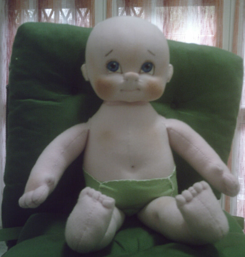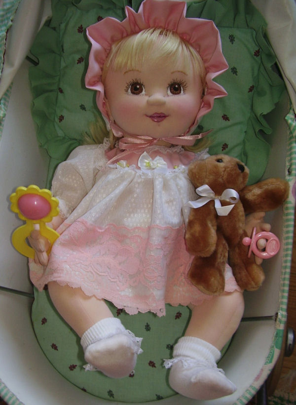 Her name is Charlotte. She is made from Darlene Rausch' s excellent doll pattern Bonnie. It was published in the Soft Dolls and Animals September 2009 magazine. The pattern has no seams on the face. She is soft sculpture baby doll and she is made from polyester knit fabric. Her eyes and lips are painted with acrylic paints. Eyelashes and eyebrows are embroidered. Her wig is purchased an her legs and arms are plastic jointed.