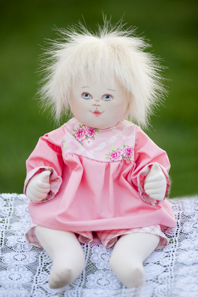 Charlotte is about 19 inches tall. She has just learned to sit. She loves puppies. The name of her favorite puppy is Bella and she often plays with it, but she also likes to play with her other toys. Sometimes she just wants to sleep or kick in her dolls pram. Her mother has sewn her the dress, bonnet and the matching booties. They are made of the polyester-cotton fabric and decorated with the lace trim.