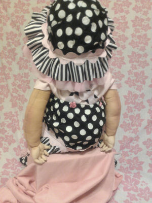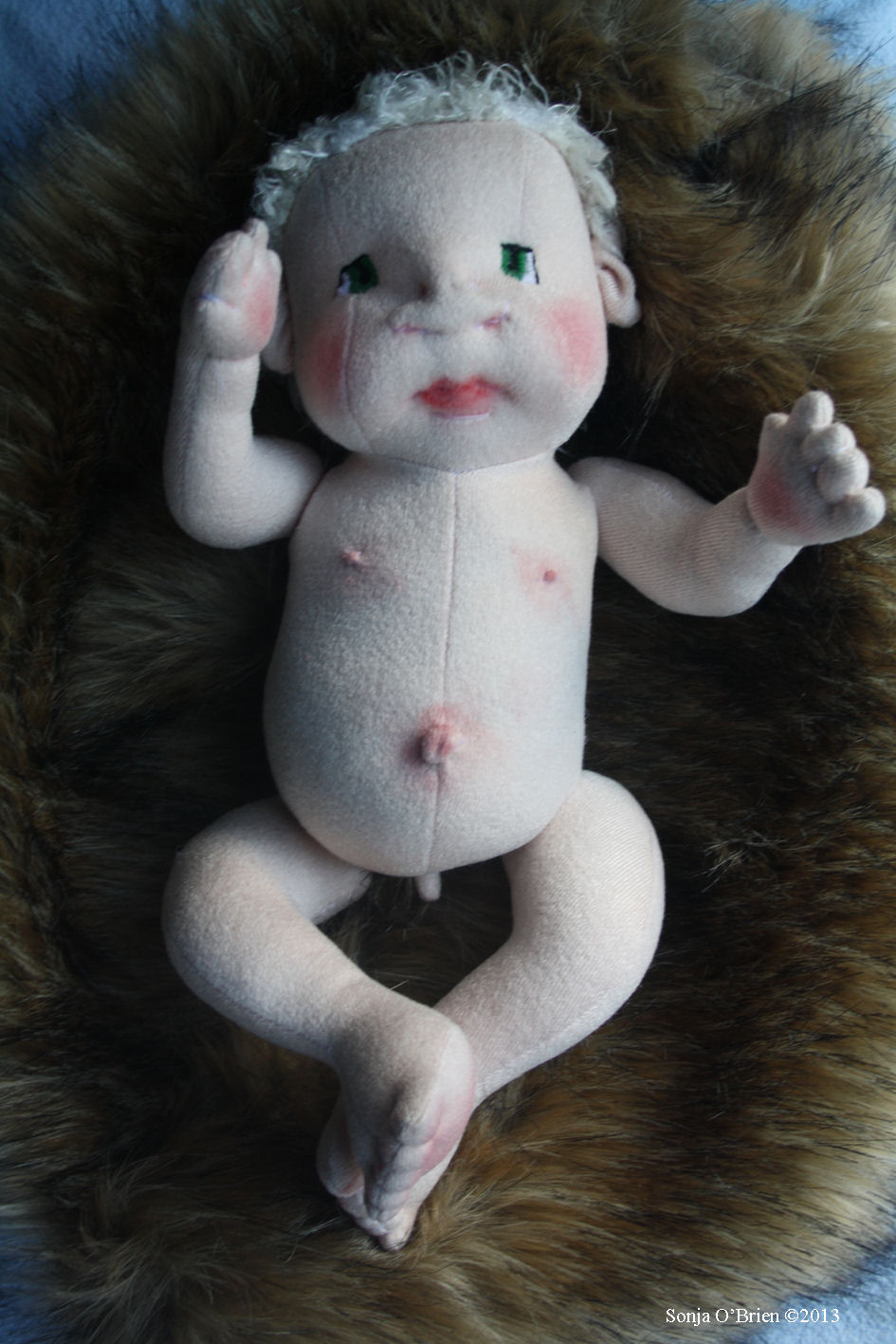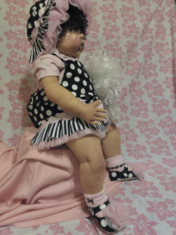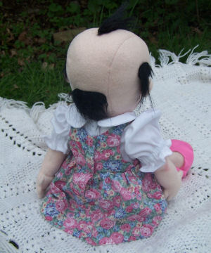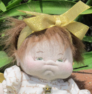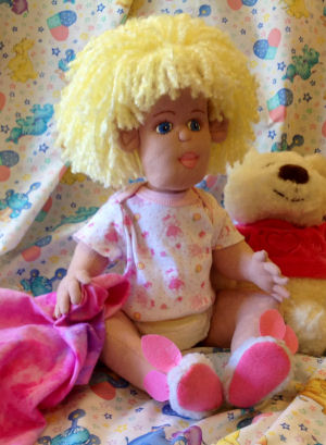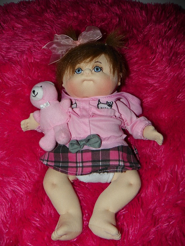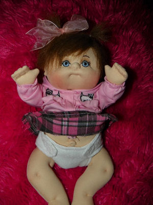 Lulu is soft sculpted of craft velour with tibetan lamb's wool hair. I made her dress, hair bow and diaper but bought her white tights.