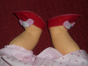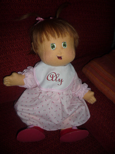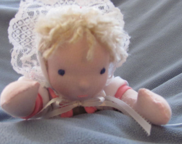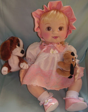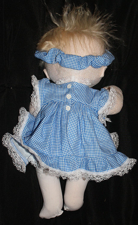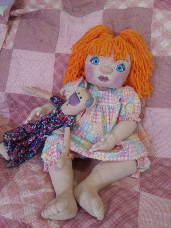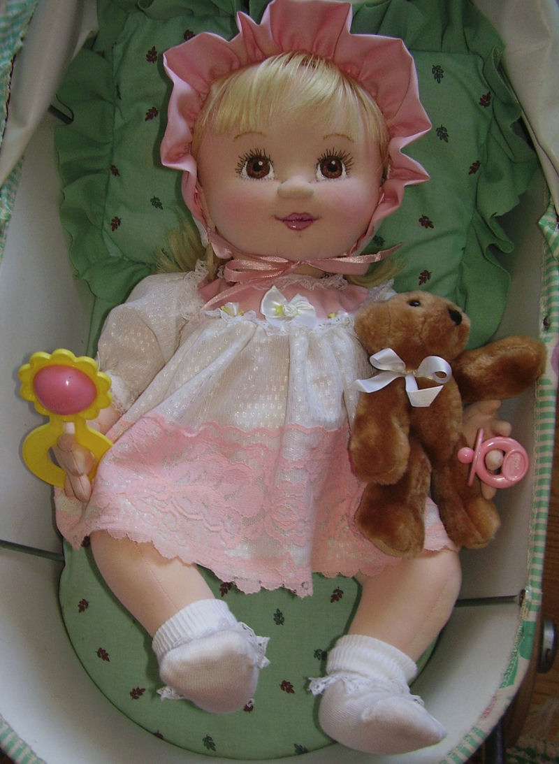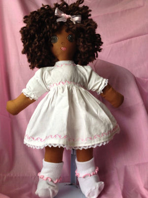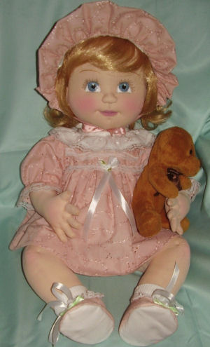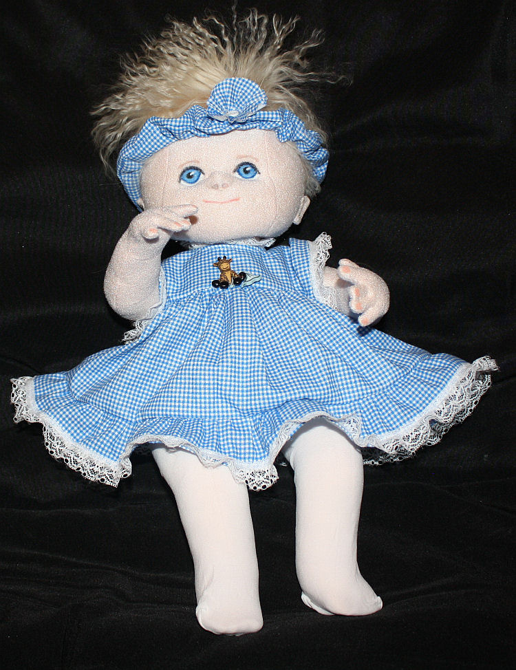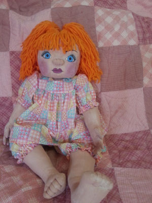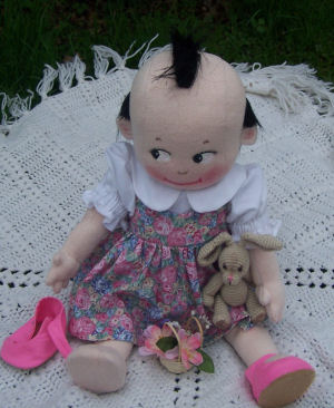 She is a lovable, cuddly 18' cloth doll. Her face is hand painted and her hair is applied strand by strand. Her body and clothing are also handmade with the exception of purchased socks. A soft, sweet doll for any little one to love.
