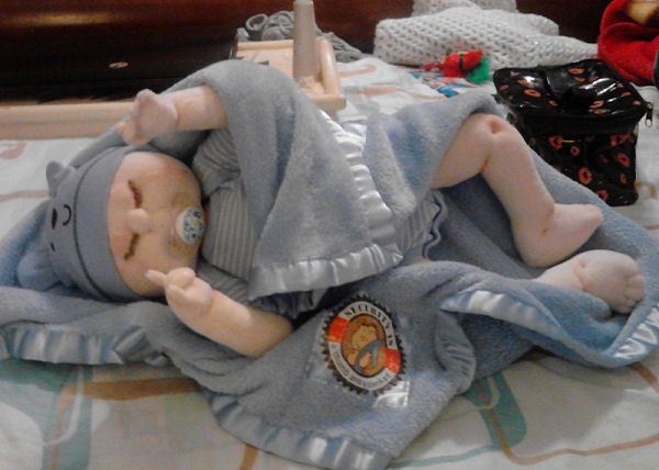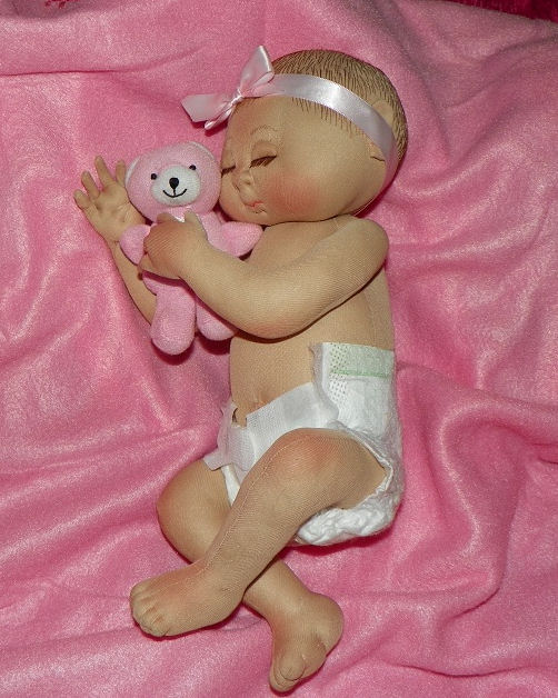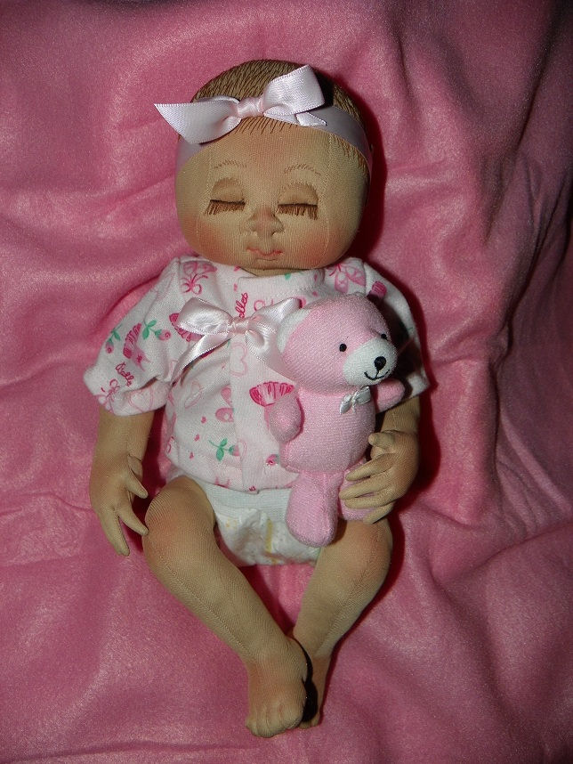 She was made using a firm stretch fabric. Her hair is hand embroidered to look like fine baby hair. Her eye lashes are made from organza ribbon threads. Her arms and legs are string jointed. Her outfit is store bought as well as her bear and favorite cozy blanket.