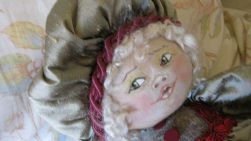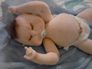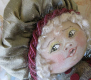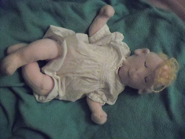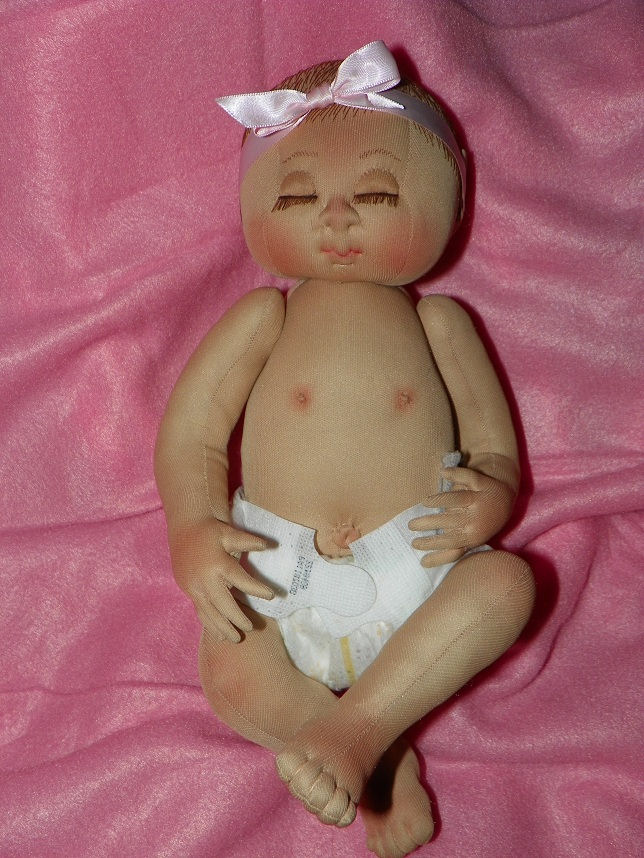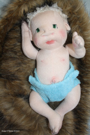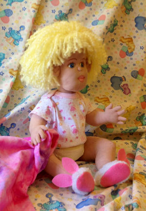 This little baby is made with knit fabric, and acrylic paints. She has joints in her arms and legs. I used Darlene Rausch's Bonnie pattern.