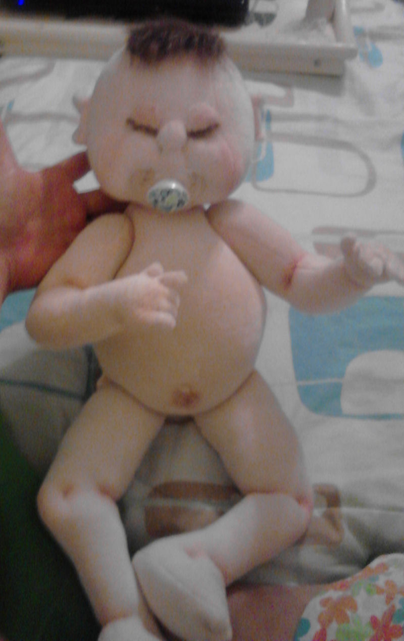 Aly is very nice and always cheerful. She is my own design taking from reference cloth doll photos and other patterns from several artists (I disjointed four or five dolls). I've been making dolls since early 2005, I was a reborn artist at first, and now I am making Art Dolls my own's patterns. Aly is an ooak cloth doll made from felted wool. The idea to make her, was the order from a good friend that wanted a cloth doll baby girl. Now, Aly lives with her new mummy in Czec Republic. Her eyes and mouth are transferred with iron from designs in special transfer paper for inkjet printer. Her arms, hands, legs and feet are needle sculpted. And her arms, legs and head are jointed with plastic joints.