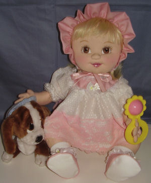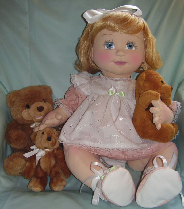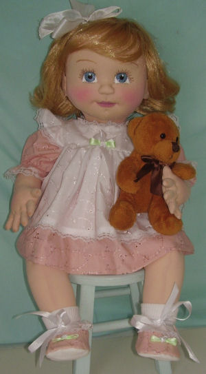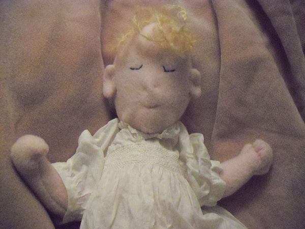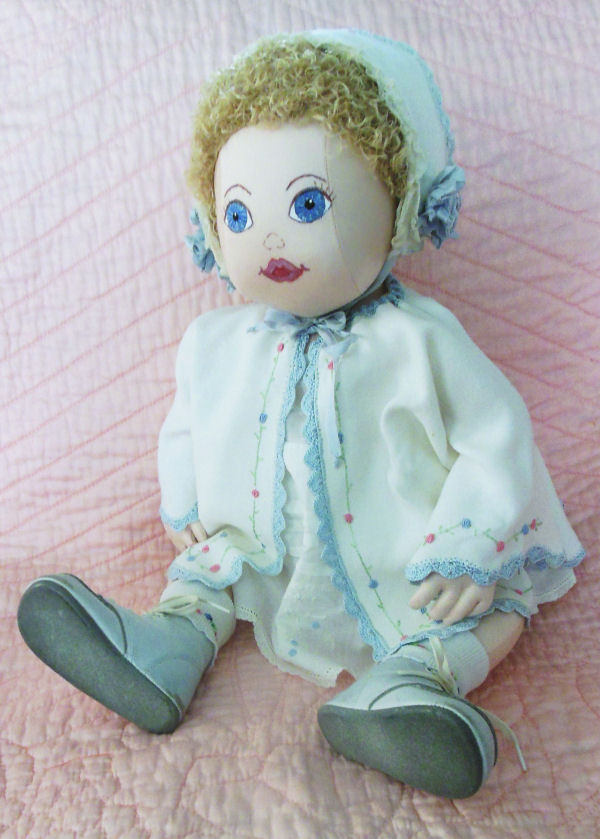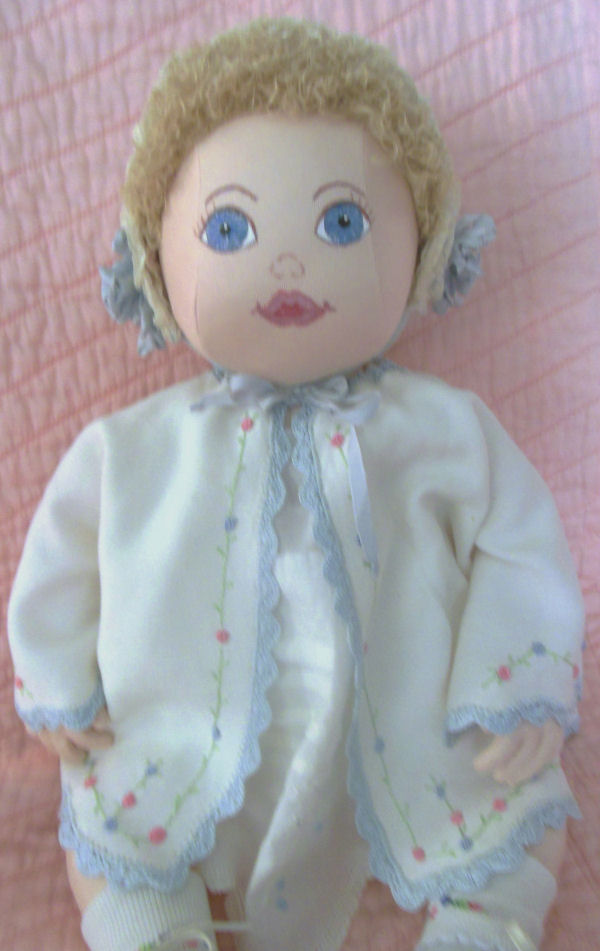 I made this doll because I wanted her to display the heirloom clothes which I had worn as an infant. I used Judi Ward's pattern, "All Are Precious In His Sight."
