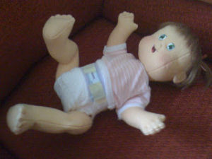This is Baby Jane she had to go to the doctor today to have her first baby shots. They hurt so bad she cried herself to sleep. There are 2 tears on her face one below each eye. There's a band aid on her right leg and a band aid on her left arm where her shots were.