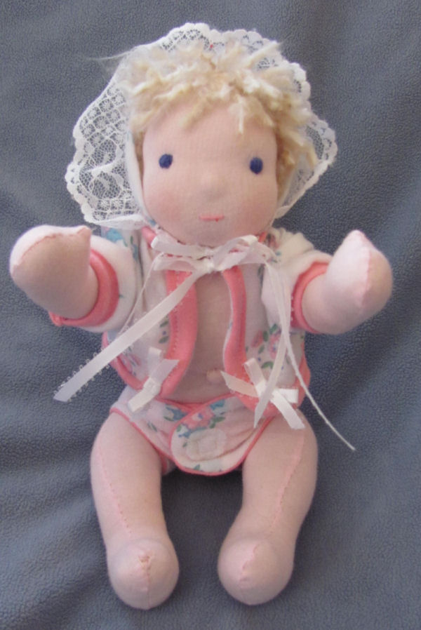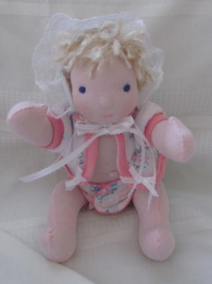 11 inch Waldorf style baby doll. All natural materials. Soft cotton interlock body, pure eco wool stuffing, Mohair hair. Cotton embroidered face. Cotton clothing. Theme is Pink and Lace and Bows. These are my own patterns for both baby doll and clothing.