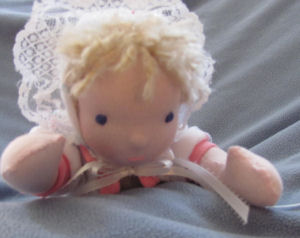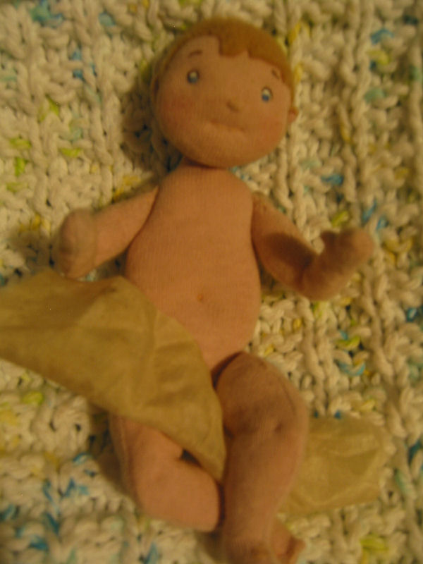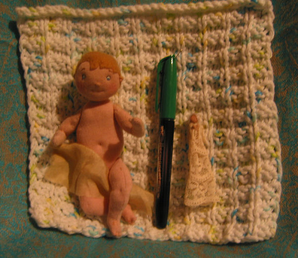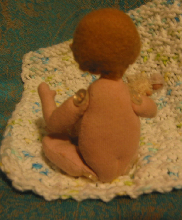 Robin is a 5 3/4 inch baby doll. I designed and made him myself, but did not make any paper pattern, so he is one of a kind. He has dimples at elbows and knees and little toes, and cute little ears that stick out. His hair is made of felt. He smells of cloves and cinnamon from a tiny sachet that I slipped in with his stuffing, but to make up for that feminine touch he has lots of baby dreams about puppy dog tails! A friend made my mother a beautiful knitted dishcloth, which I borrowed for Robin's blanket. I made him a christening gown (not shown) and his little three inch baby doll.
