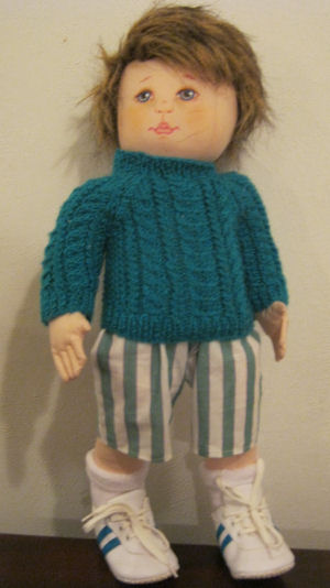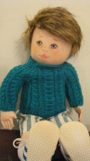 My name is Sammy and I am a real Kiwi kid. My mummy made my sweater and pants. My hair looks a bit scruffy but so would yours if it were made of fake fur. I'm made from Kezi's Alsea pattern. I am made of a very tightly-woven cotton.