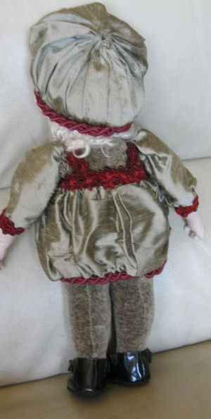 I made Merri and her ensemble, including the shoes- from McCall's pattern #2995(licensed from Jesco). She measures 15", standing and is 4-way jointed. I have given her the impish grin, the side-glance eyes, and the tufts of hair that are her known trademark. Merri is holding a crocheted bunny, that is my own creation, and the basket of flowers, I have purchased.