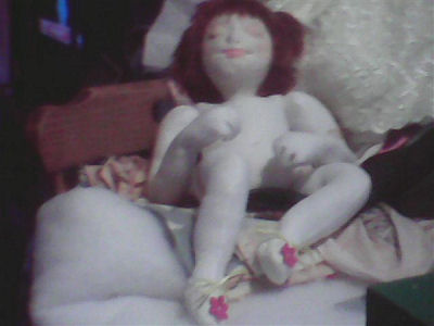 This is Angel. She is a soft sculpture doll of my own design. Angel is made out of craft velour. Her brown hair is craft fur made into a wig and hand sewn to her head. Her green eyes are embroidered by hand. Angel is very detailed with sculptured hands and feet. She even has a little tushie and belly button.
