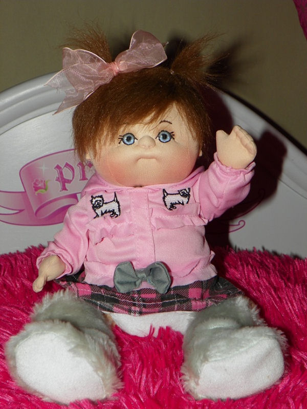 Baby Lulu is a sweet baby but already a bit mischievous. Her hair is totally out of control but she has sweet dimples. She loves her new blue gingham dress that matches her eyes.