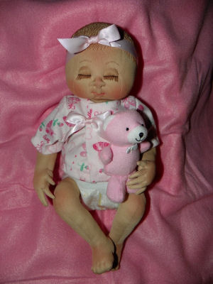 Ava is a sleepy little preemie. She loves nothing more than to be snuggling up with her little pink bear while she sleeps. She also loves to be held close so that she can hear your heartbeat. Ava was made using a combination of Judy Ward baby patterns and some tweaking to the body style done by me. She is soft sculptured using a combination of Judi Ward and Kezi Matthew's "Dear Ones" techniques as well as a bit of my own technique.