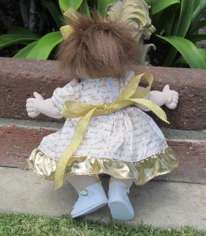 Angel is wearing a homemade dress with matching panties. The print on the dress is the poem "Starlight, Starbright." It is trimmed with gold ruffle and gold ribbon sash. It has 3 gold star buttons adorning the front. To top off the outfit she has a gold ribbon bow on her head and white patent leather shoes.