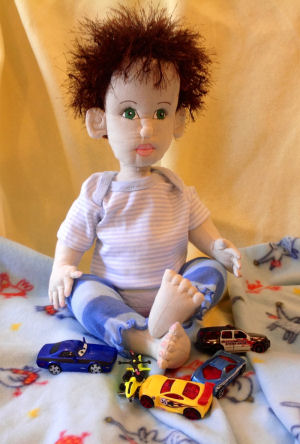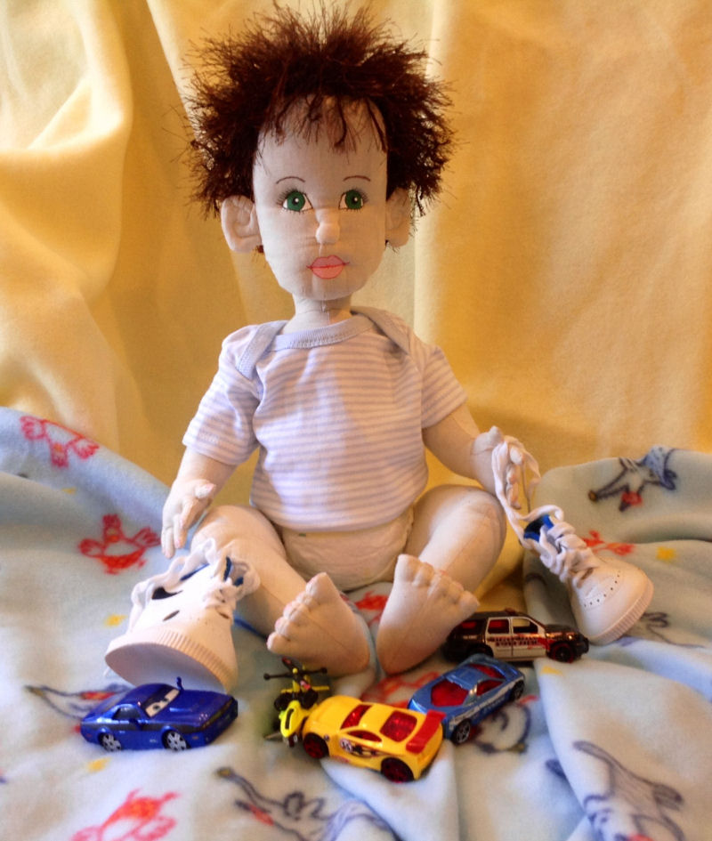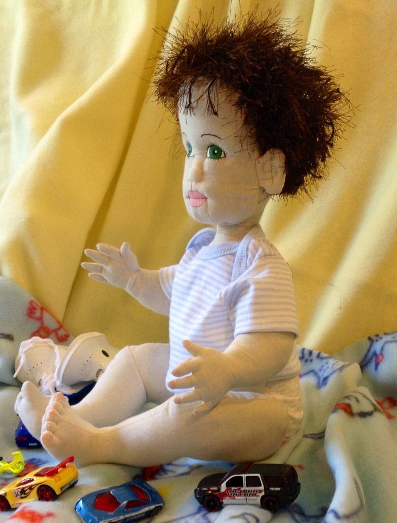 Meet A.J. He is 18", made from muslin and has eyelash yarn for hair. He is made from Darlene Rausch's Bonnie pattern from the Soft Dolls & Animals Sept 2009 issue. He has jointed arms and legs. He is wearing an altered onesie, diaper and altered leggings. He is playing with his purchased doll shoes cars.