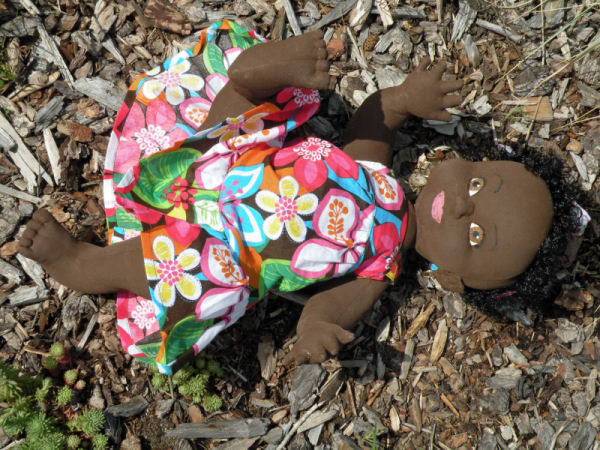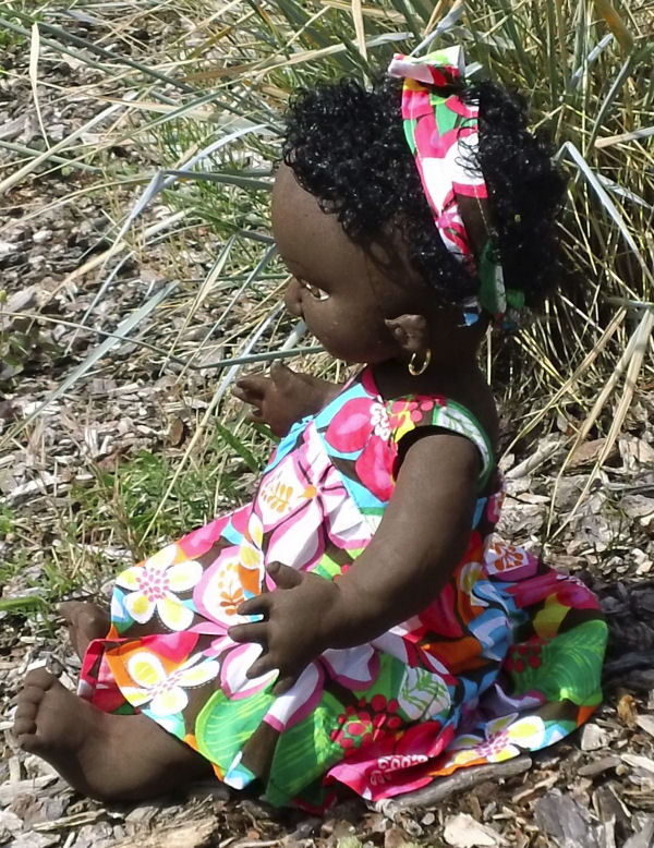 Zola is a little African baby, she is 18" tall. She is wearing a baby dress that was customized to fit her since she is small for her age. Her hair bow was made from the extra fabric taken off her dress. Zola is a very adventurous baby enjoying the sun and ready to explore and meet new friends. |