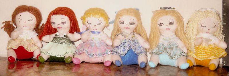 Hannah, Joline, and Susan are very sad today. It is shopping day with Mom, but Mom can only take three little Pitty Pots at a time. So they have to stay home with Daddy this time. Next time they can be the Happy Little Pitty Pots and Angela, Amy and Irene will be the sad little Pity Pots. After all six little Pity Pots are to much for Mom to handle at one time, but she always has plenty of love to go around for them all.