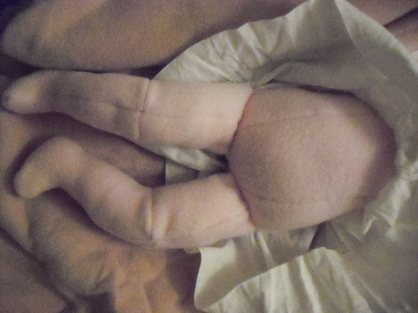 detailed. She is wearing a store bought onesies and socks diaper as