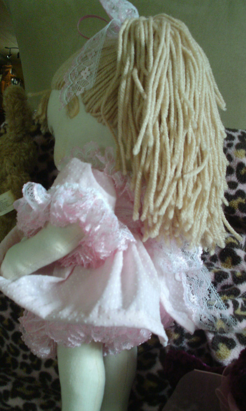 Cindy Lou was made from a vintage pattern, originally called "Tillie." She has jointed arms and legs. Her fingers and toes are sculpted and her nails and toenails are painted pink. Her face and ears were created using paint and colored pencils. She has 4 baby teeth. Her hair is made from individually attached sections of beige yarn. Lace and ribbon bows adorn her full pony tail. Her pink dotted-swiss dress and ruffled shorts are made from vintage fabric and lace. The lace was hand-gathered around the legs and sleeves to give it extreme fullness. A lace sash is tied into a big bow in the back. Both Cindy Lou and her outfit were completely hand sewn.