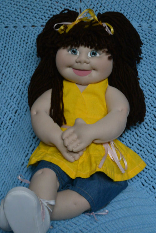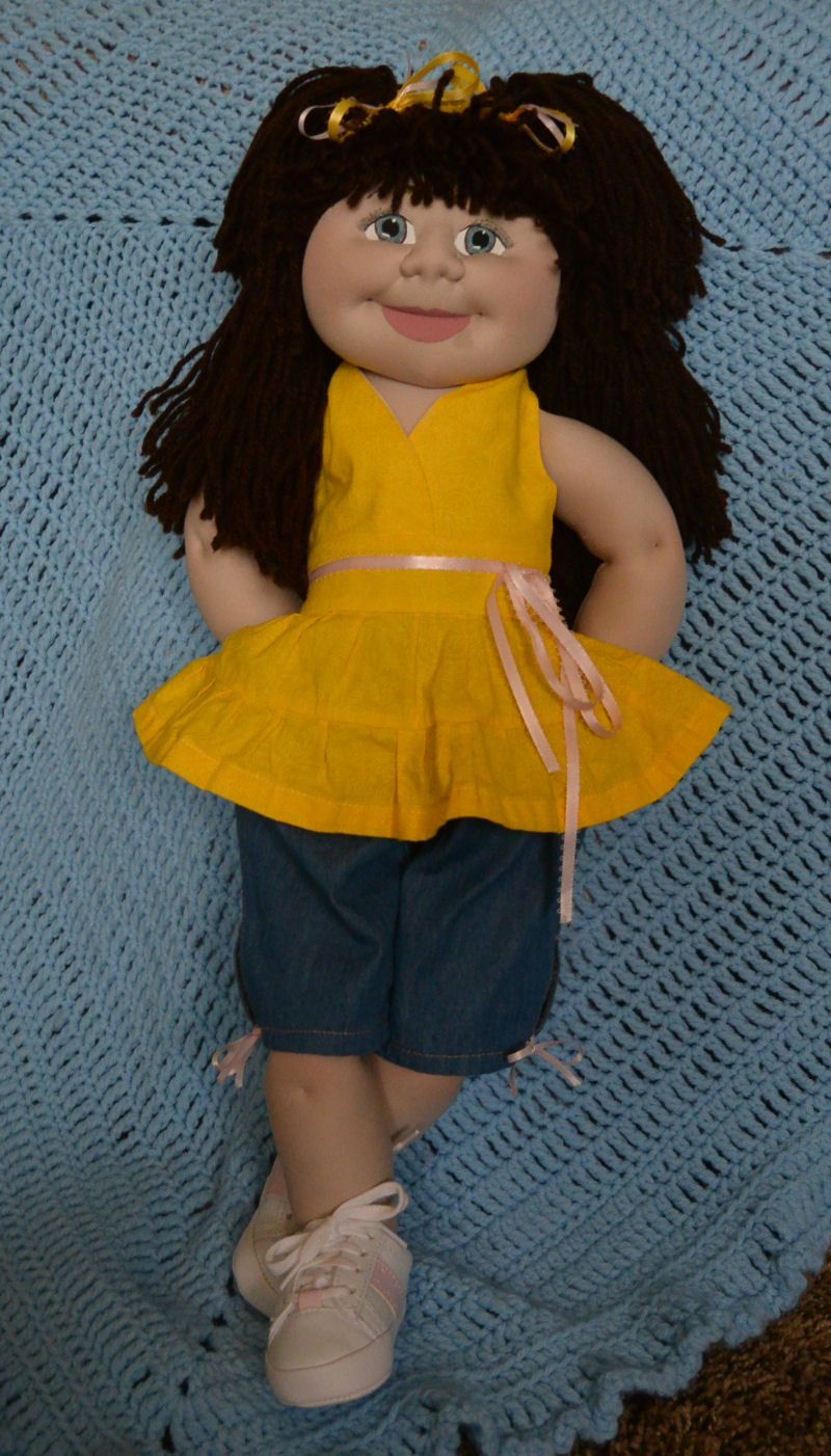 The patterns for Ali & her outfit are my design. Ali is approx. 22" tall. She's made from poly interlock fabric, 100% polyester fiberfill, 100% acrylic yarn, polyester thread & acrylic paints. All materials are non-toxic & non-allergenic & totally machine washable. Her seamless face is hand painted. Her entire body is hand stitched with approx. 40 stitches per inch. Her yarn strand hair is individually sewn into her scalp. Her halter, capris & bikini panties (not shown) are all cotton fabric. The ribbons & sneakers were purchased.