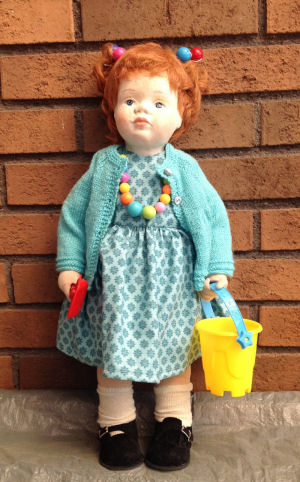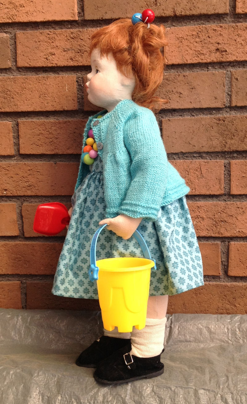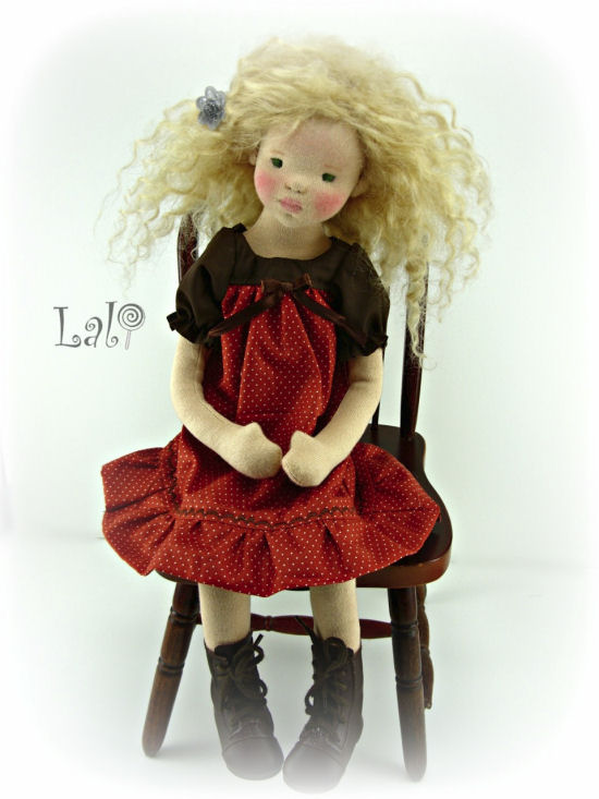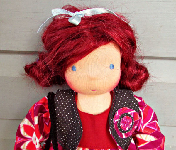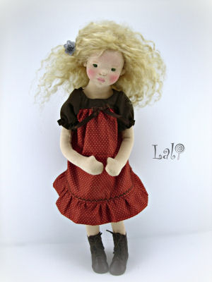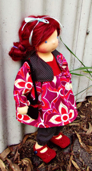 The pattern and clothing are an original design. The doll is 16" tall. She is wearing a mohair weft wig made after the tutorial of Fairywooldolls.