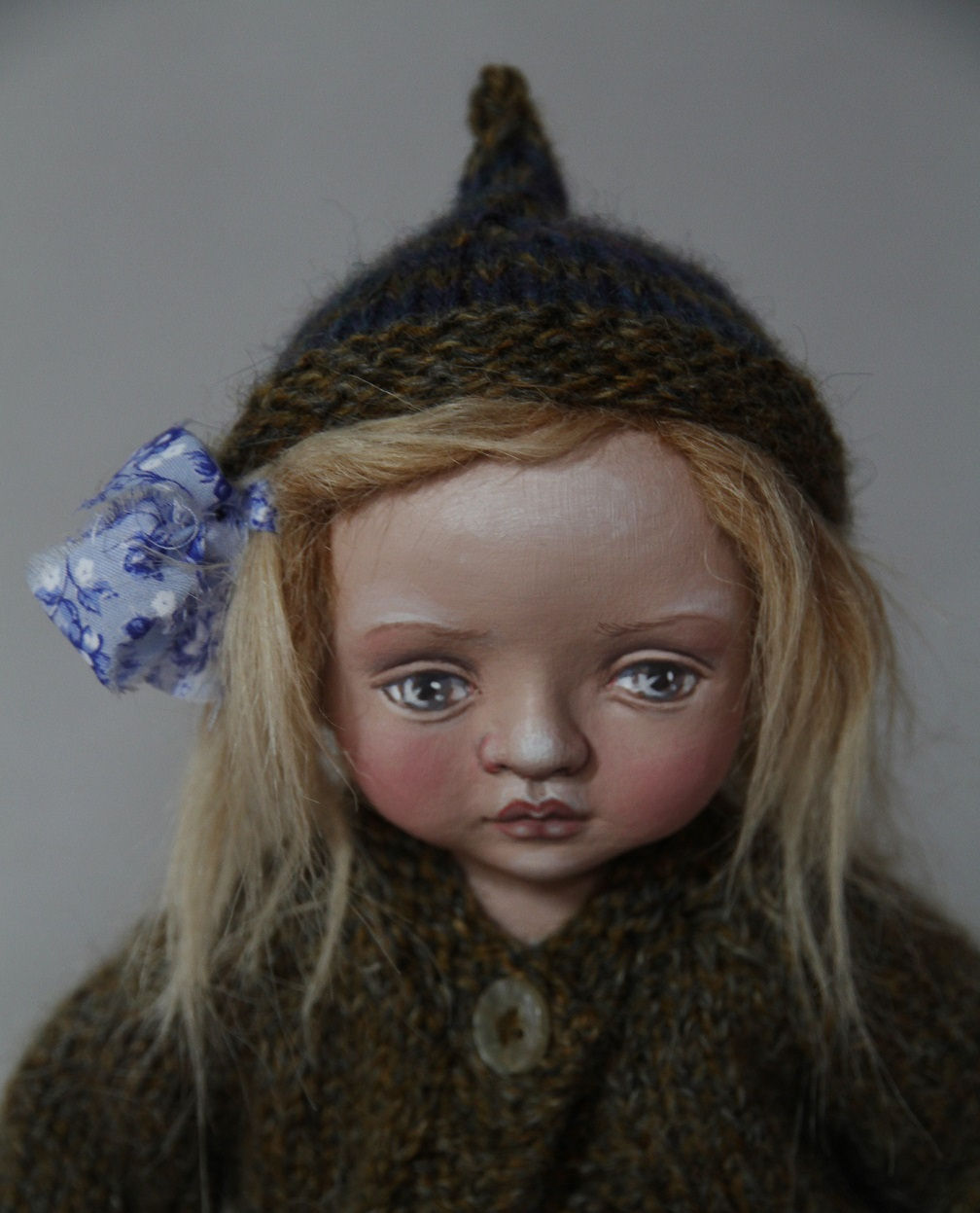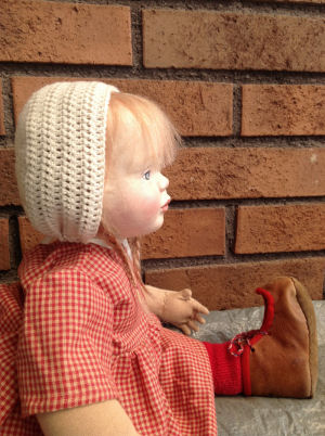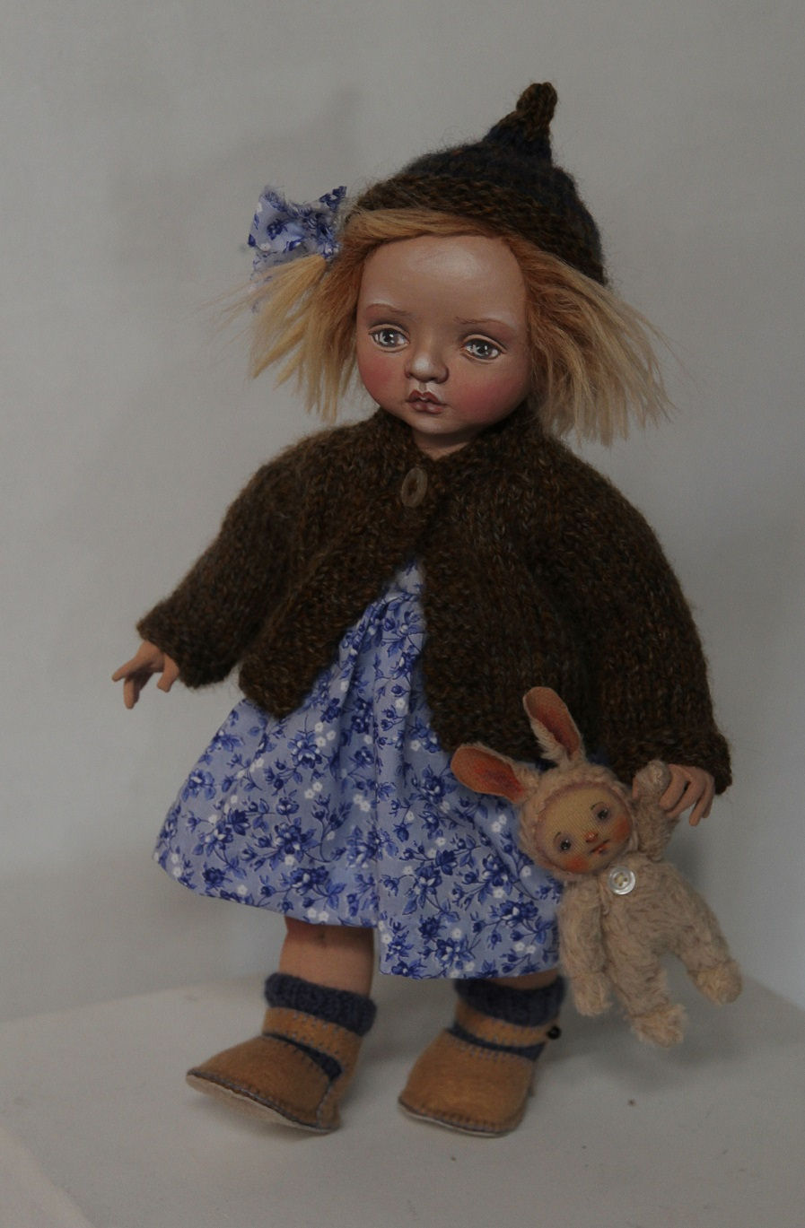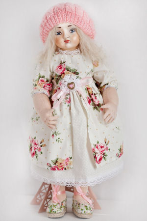 Her hat is hand-knitted. She's rather heavy thanks to her stuffing. Adelina's height is about 50 cm. It's my original design.