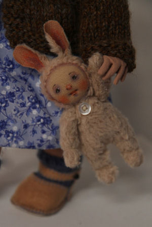made from a piece of fur fabric. Her hand-made clothes include a cotton print dress and bloomers, hand-knit cardigan, hat and socks and felt shoes. She and her bunny doll are inseparable! Lizzie represents a three year old child.