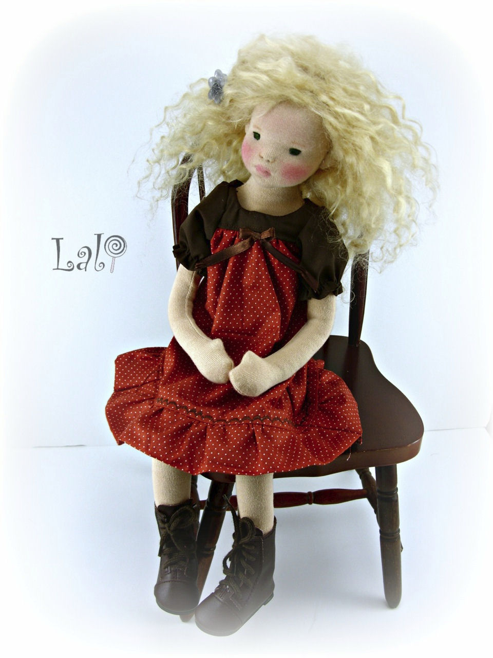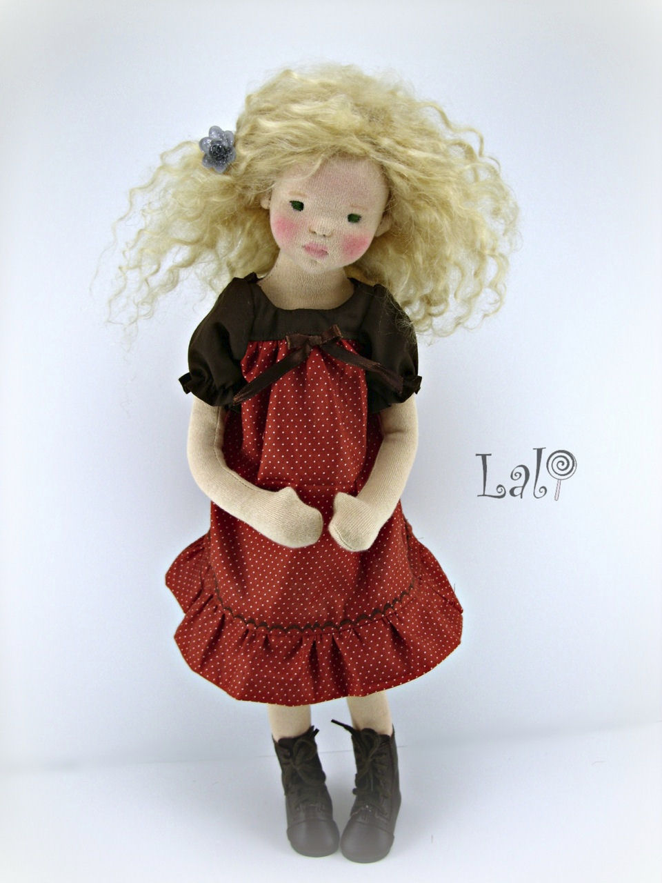Faye is a handmade Earth doll, meaning she is made with all natural materials. She is an art doll standing about 16" tall. Her inner core is a bendable wire armature, which allows her to bend and hold poses at almost any place on her body. She can sit, stand, bend at the wrists, elbows, knees, waist etc. She is stuffed with wool. Her face is needle felted for shape/detail. Her face and body are covered in cotton knit fabric. Her face is detailed with coloring and stitches, no paints are used, only natural beeswax crayons. Her eyes are embroidered from cotton floss. Her wig is handmade from mohair weft and sewn into a wig. Her dress was handmade by me from cotton fabrics. Her boots are store bought doll shoes.