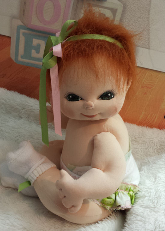 Reba is made from deer suede and is about 15" tall. She has red fur hair and painted eyes. I just love her little button nose. She is partially soft sculpted with all ten toes and all ten fingers.