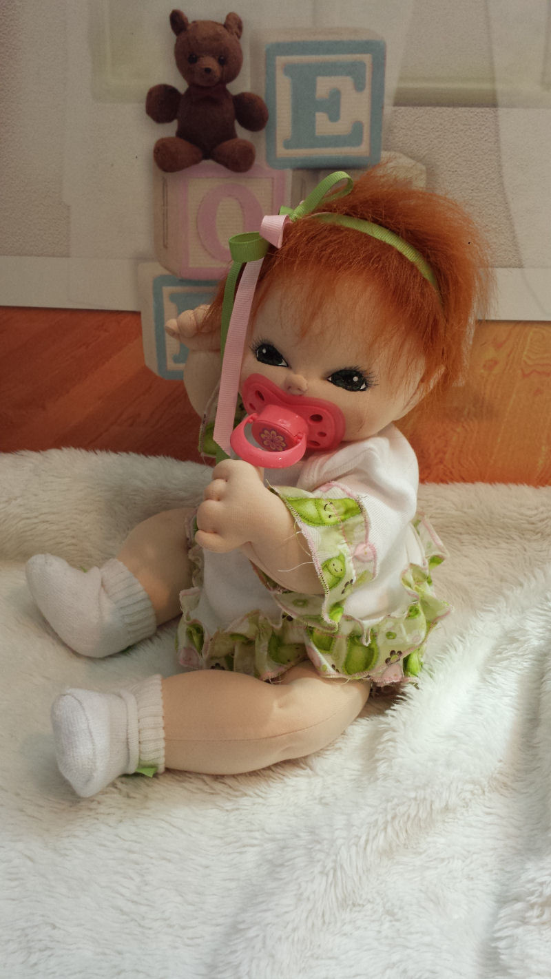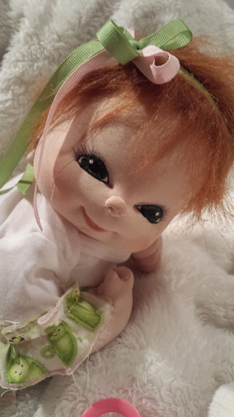 Her clothing, once a plain white onesie, now a cute 2 piece playset. Reba just loves peapods and her outfit! I added plenty of ruffle onto her outfit, along with an appliqué on the shirt.