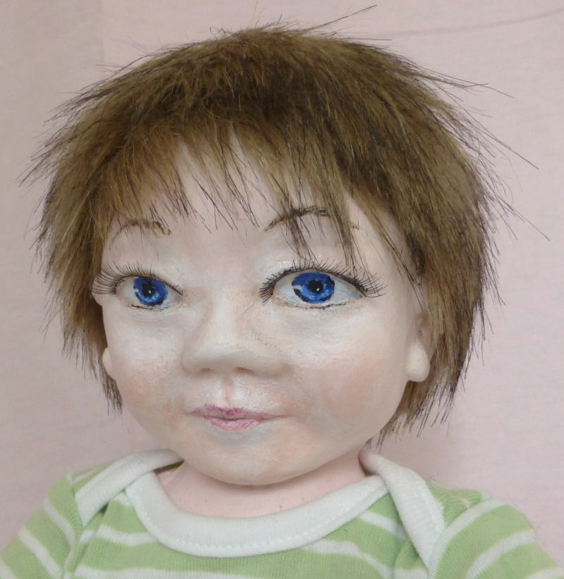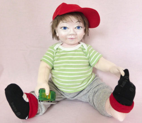 "A J" is an original doll designed by me. He is 19 inches tall and has a fabric molded head. His hair is made from craft fur. He is fully jointed. I tried to give him a mischievous, sweet little face as that is the personality "he" indicated he wanted to be. His clothing is store bought and remade to fit his little frame. His favorite toy of the moment is a car which he has "borrowed" from my grandson. He did enjoy posing for his pictures.