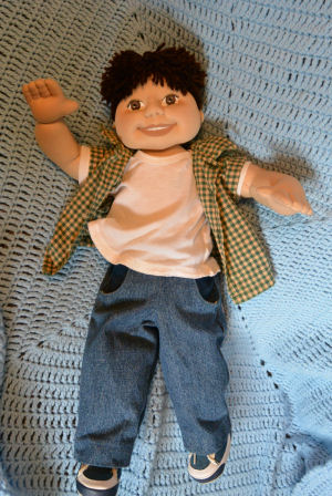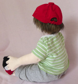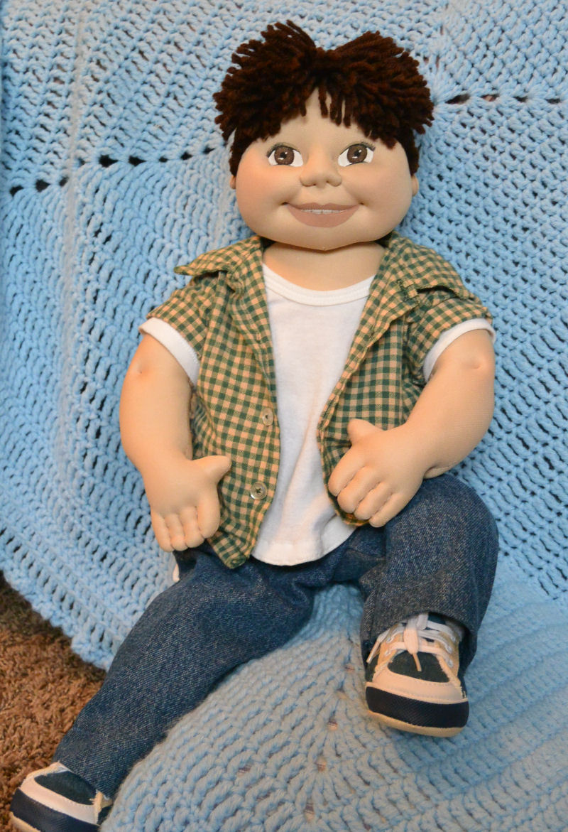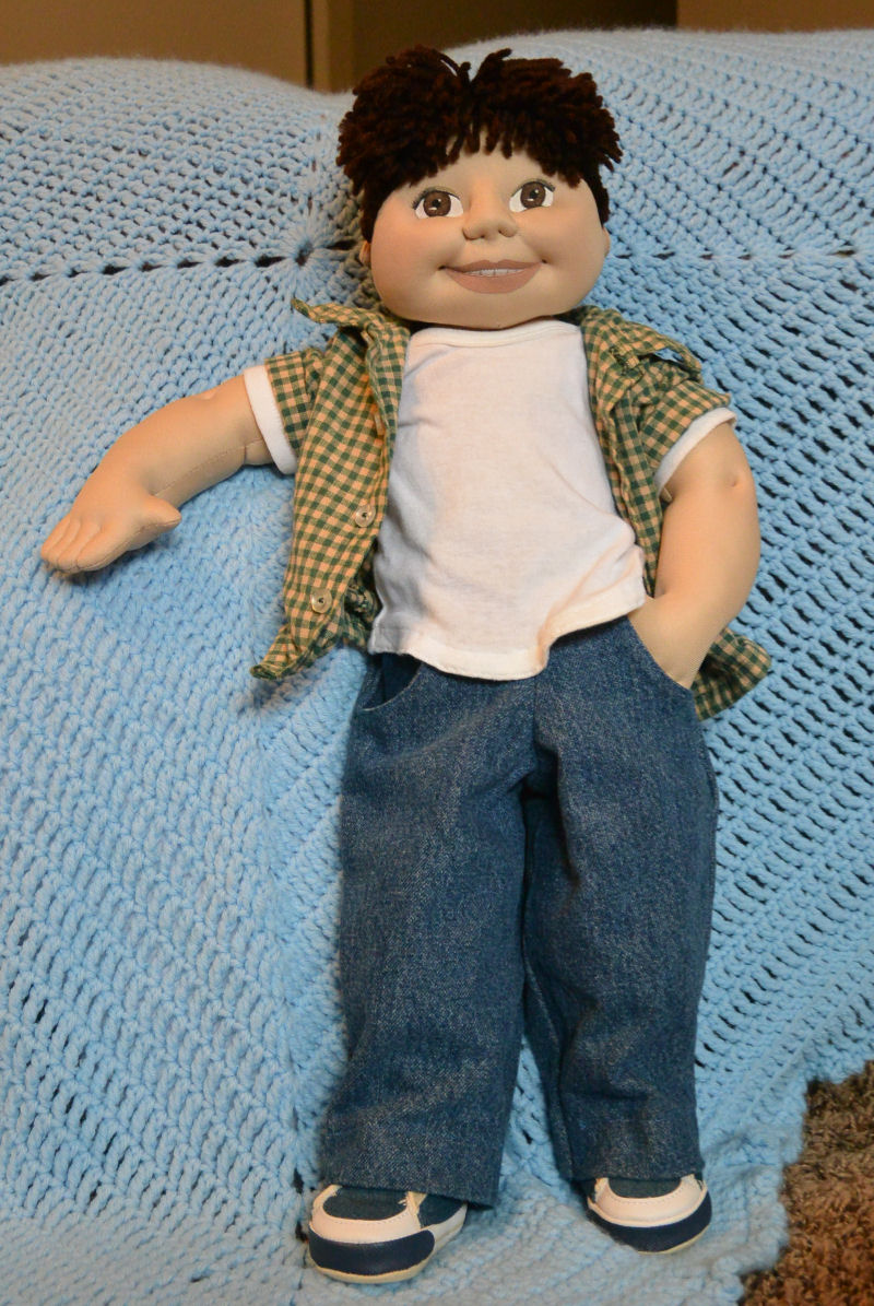 The patterns for Ronny and most of his outfit are my design. Ronny is approx. 22" tall. He's made from poly interlock fabric, 100% polyester fiberfill, polyester thread, 100% acrylic yarn & acrylic paints. All materials are non-toxic & non-allergenic and totally machine washable. His seamless face is hand painted. His entire body is hand stitched with approx. 40 stitches per inch. His yarn strand hair is individually sewn into his scalp. His shirt, jeans & boxer shorts (not shown) are cotton & his cotton T-shirt is a purchased onsie that I modified. The sneakers & socks were purchased.
