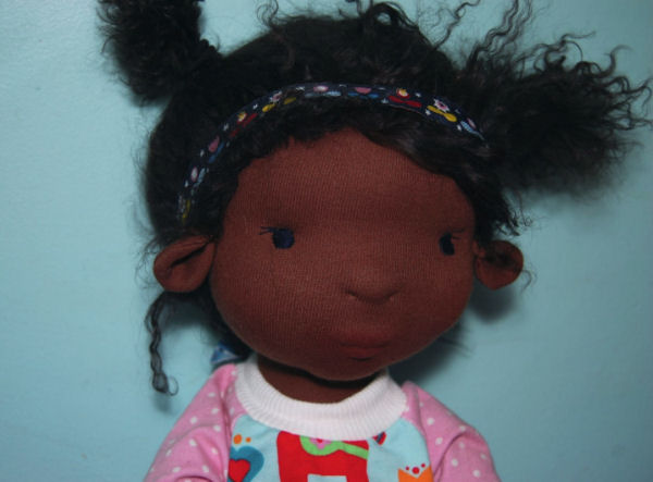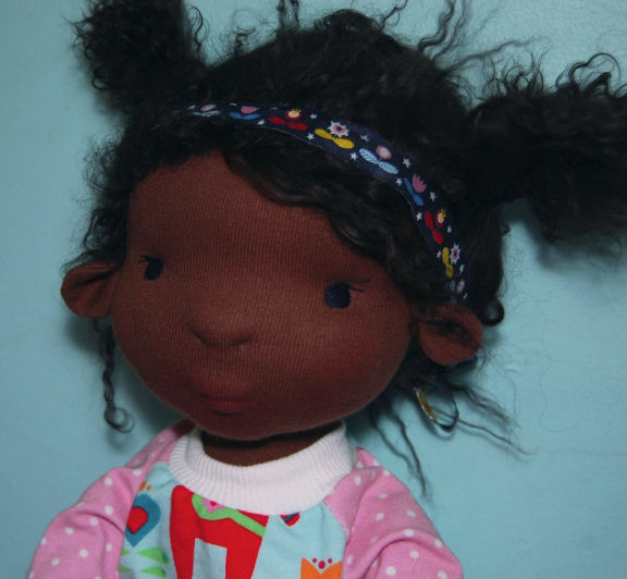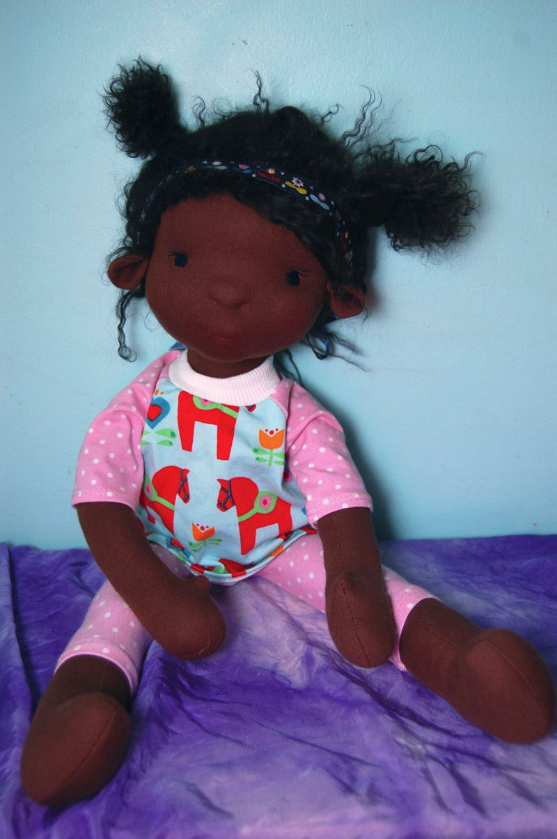 Tiana is an original slender doll pattern by Crystal Tew Clark, of Oh Juniper! Natural Handmade Dolls. She is 19 inches tall, made out of cotton knit and lambs wool. Her face has been needle felted before covering with with knit fabric. Her hair is made from Tibetan lambskin. I dressed her in a casual outfit that I made.