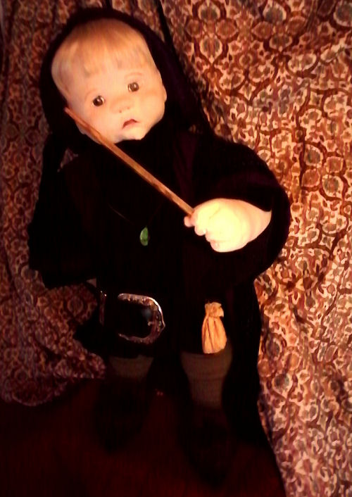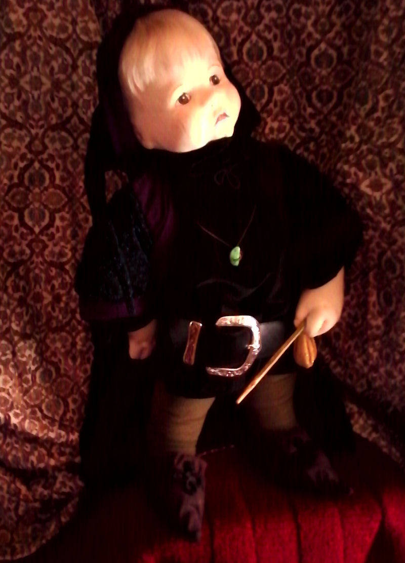 Head molded from one piece of fabric, 3 layers thick, not a mask. Chucky body of 3 layers of alternating grain knit fabric for a `flesh-like`feel. Vintage belt, cherry wood wand, and jade talisman. 24" tall. Acrylic features.