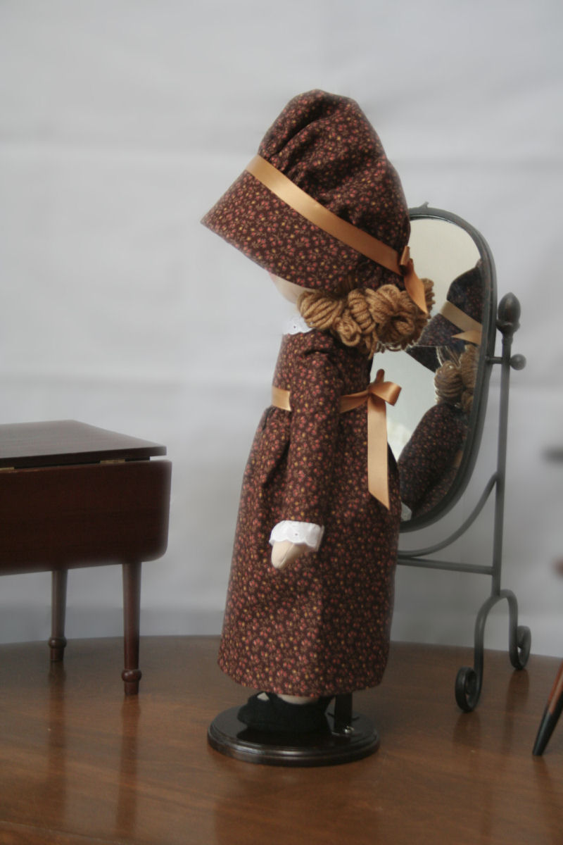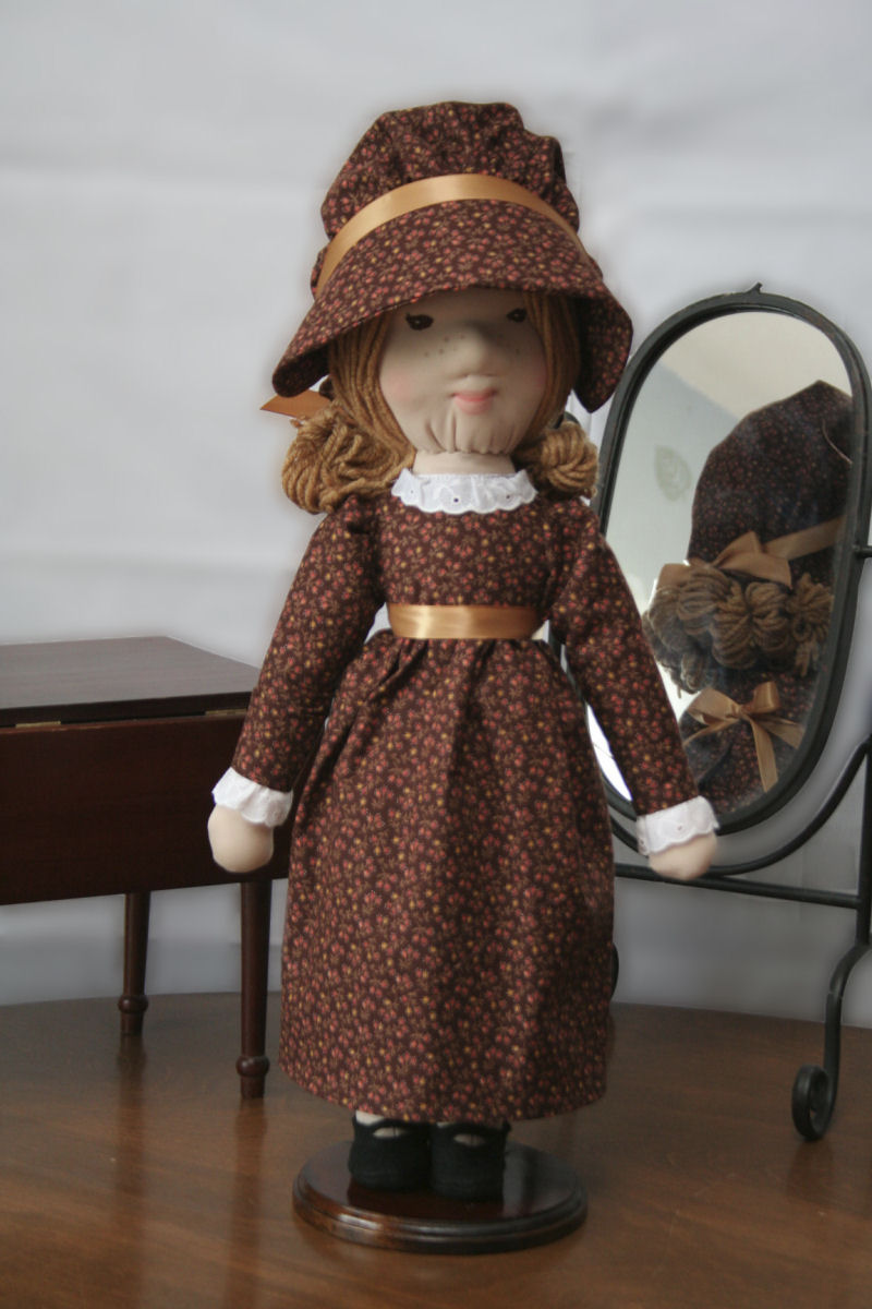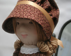 Meet Holly Hobbie, my second doll I've ever made. I used the vintage Simplicity pattern 6006 and used the face molding technique from Cutest Creations. I had a hard time with the face and trying to get the folds out of the neck. Rather than using a sock for the head and cotton for the body like the Simplicity pattern said, I used a stretch knit fabric I purchased for making soft-sculpture dolls. For the dress, I used some vintage-looking fabric from my mom's stash that she had given me a long time ago. For the shoes, I used black felt.