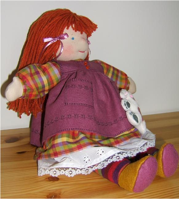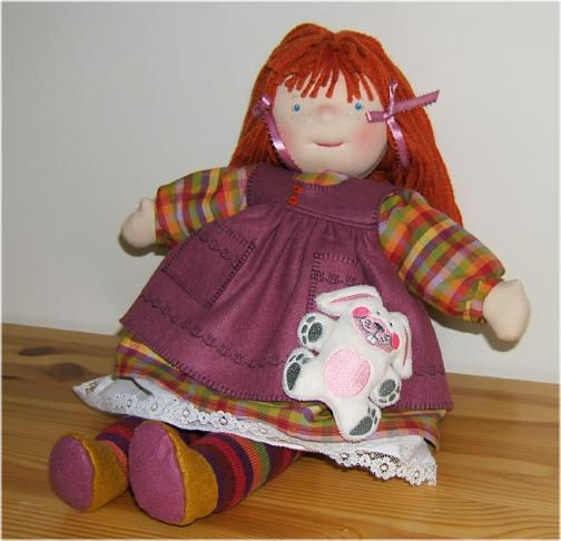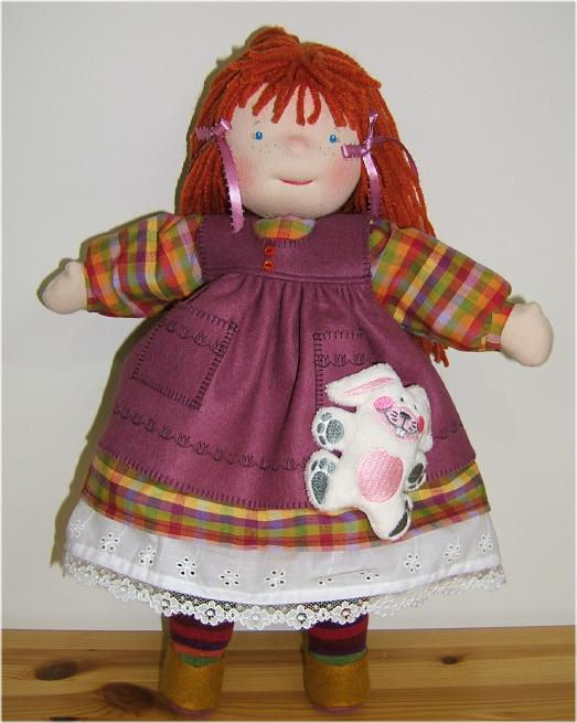 She is about 17" tall and is dressed in a cotton dress, panties and petticoat with a wool felt jumper and shoes. Her socks are a fun stripe and she has a little machine embroidered bunny attached to her pocket. She can be gently played with but not washed as she is authentically stuffed with wool.