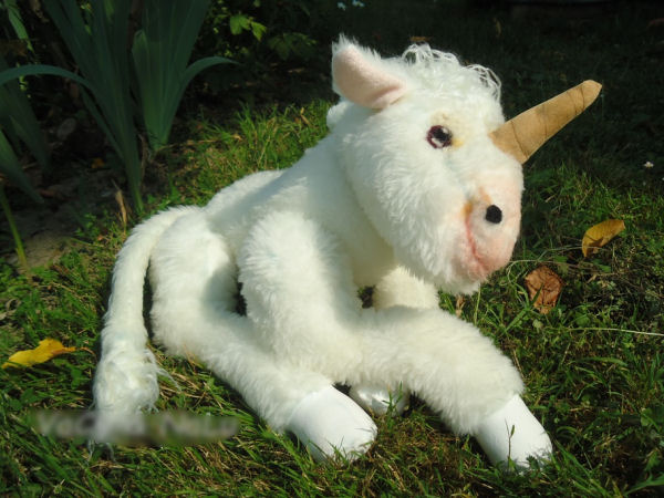 The pattern of this doll is from Jennifer Carson's brandywine pattern. This baby unicorn is in white fur and is stuffed plastic pellets in the legs and ployester fiberfill for the rest. Se has 5 joints. Her nose and her eyes are embroidered.
