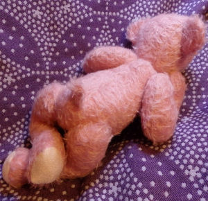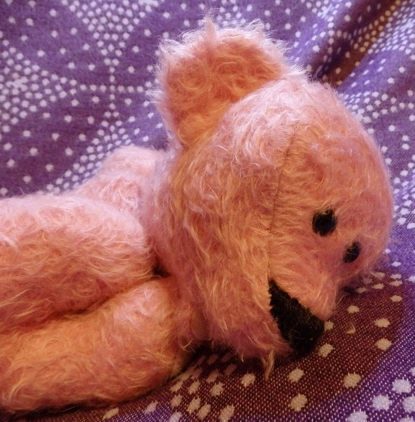 The pattern of this doll is from Caroline Krystal-Lebaz's dreamer pattern. This baby bear is in pink mohair and is stuffed with kapok. He has 5 joints and safety eyes. His nose is embroidered.