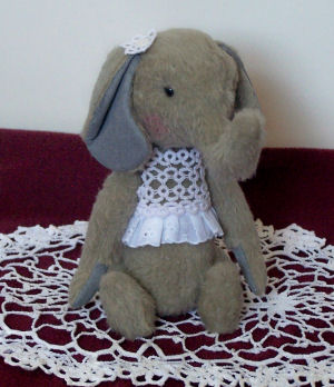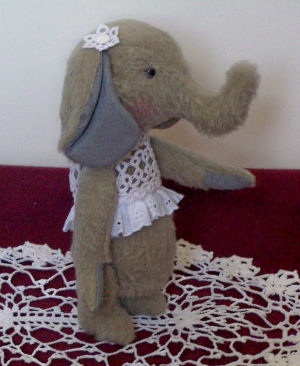 This pattern is -Folk Art Primitive Elephant - designed by Connie Hindmarsh. I have made the elephant from an artificial fur lining of a coat and used gray suede fabric for the inner ears and hand paw pads. She measures approx. 10" tall when standing and is 5-way jointed.