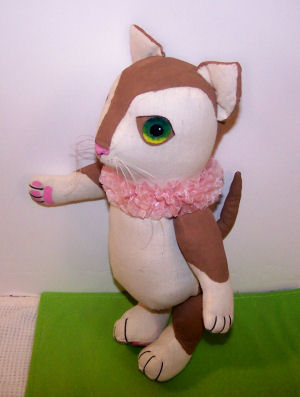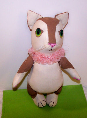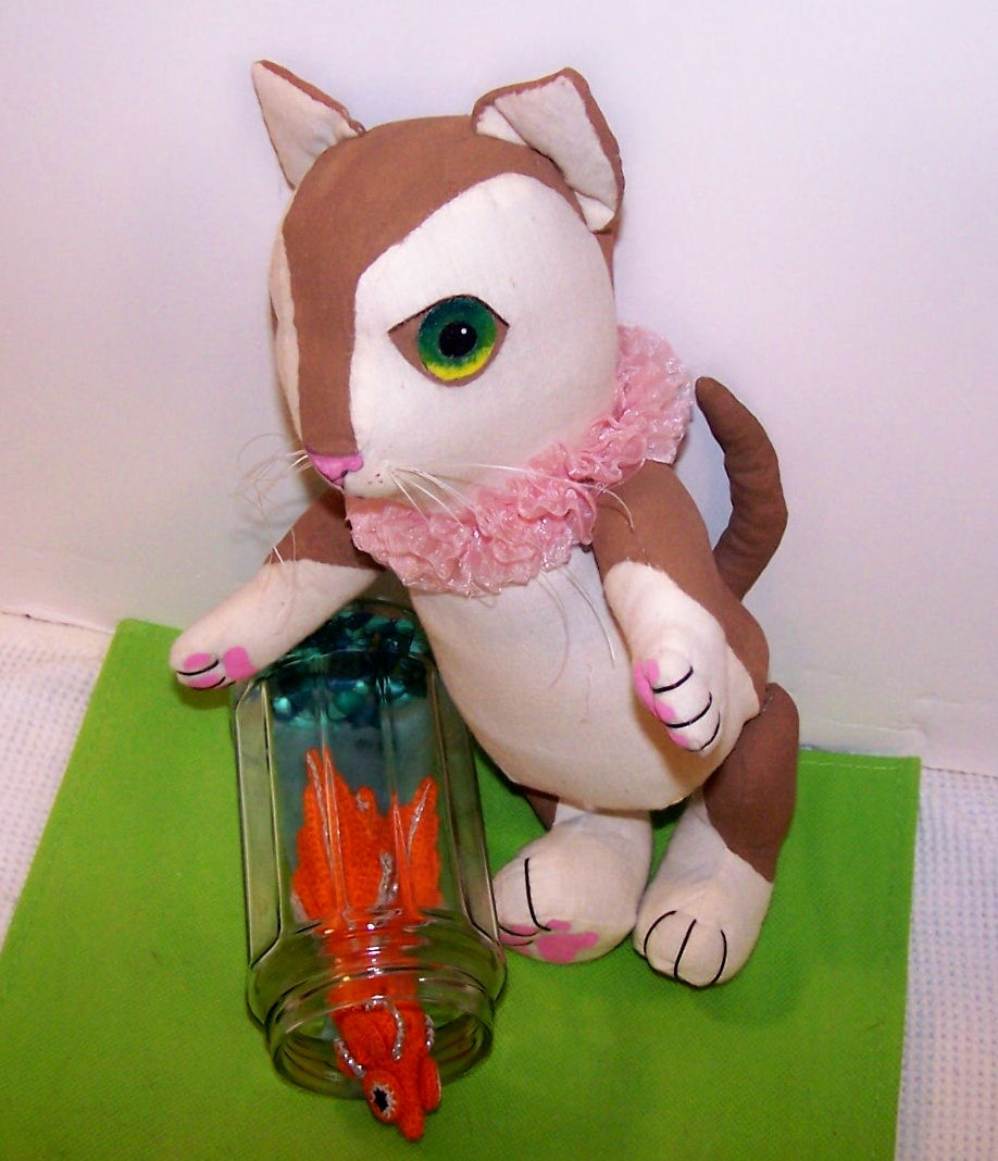 Cuddles has been created and designed by me: made from muslin fabric, and painted with acrylic paints. There are some embroidered features also. She measures approx. 10.5" tall standing, not including her ears, and is 4-way jointed. The crocheted fish prop that I created is from- http://www.ravelry.com/patterns/library/20g-crocheted-fish and the fish's container, I created from a jar with liquid clay and pebbles.
