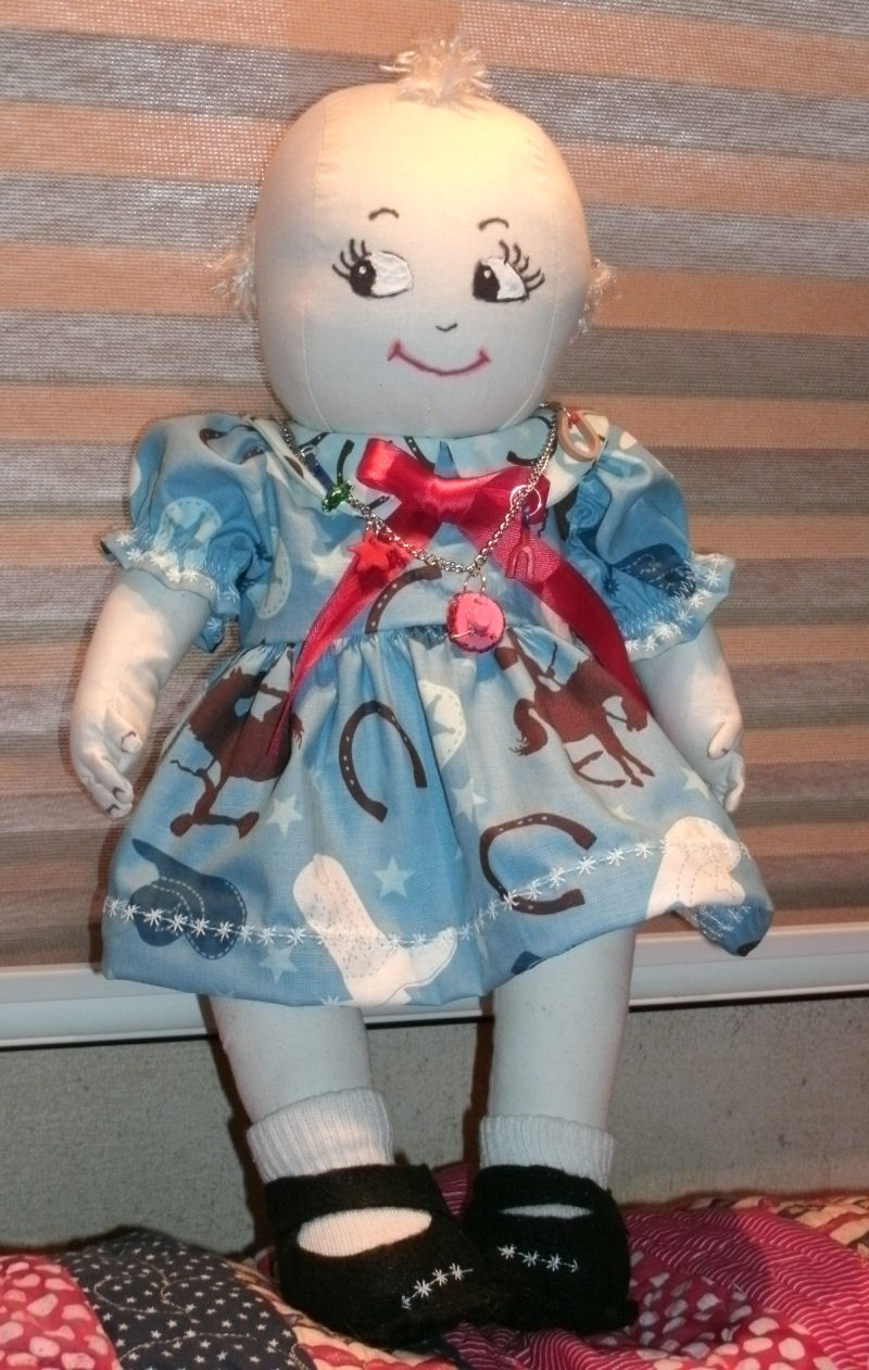 Hi, I'm Alexis Jane, I'm about 1 years old and about 14" tall. I was made from a Kewpie doll pattern by McCalls. I'm wearing my new rodeo dress with the necklace made by my Uncle Ace and my Mary Jane shoes.