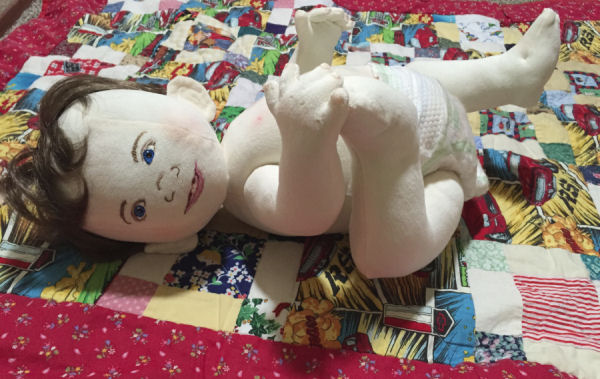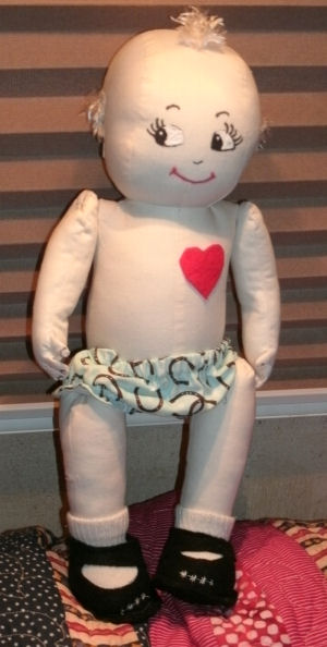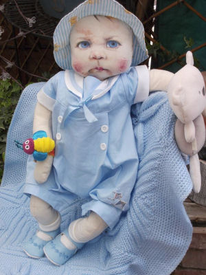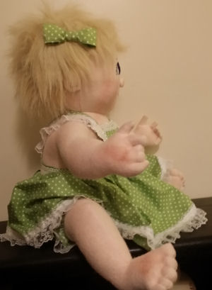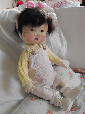 This doll is a newborn and is made with velour and has a fleece 'under-skin', so the doll is softer and strong. She has plastic joints at arms and hips. The face which is embroidered, the toes, the nipples and belly-button are needlesculpted. The fingers are articulated with chenille stems and she has an opposable thumb. She has a wobbly head. She wears real baby cloth.
