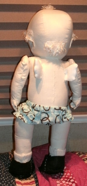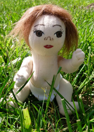 This is Emily Jane. She's from the Tiny Baby Love pattern by Judi Ward. She's a mere 9" tall and made from craft velour. She's fully sculpted with 10 fingers, 10 toes, belly button, and even a dimpled little tush. Here she is just enjoying a nice Spring day in just a loose little nappy. Enjoying the breeze in her hair.