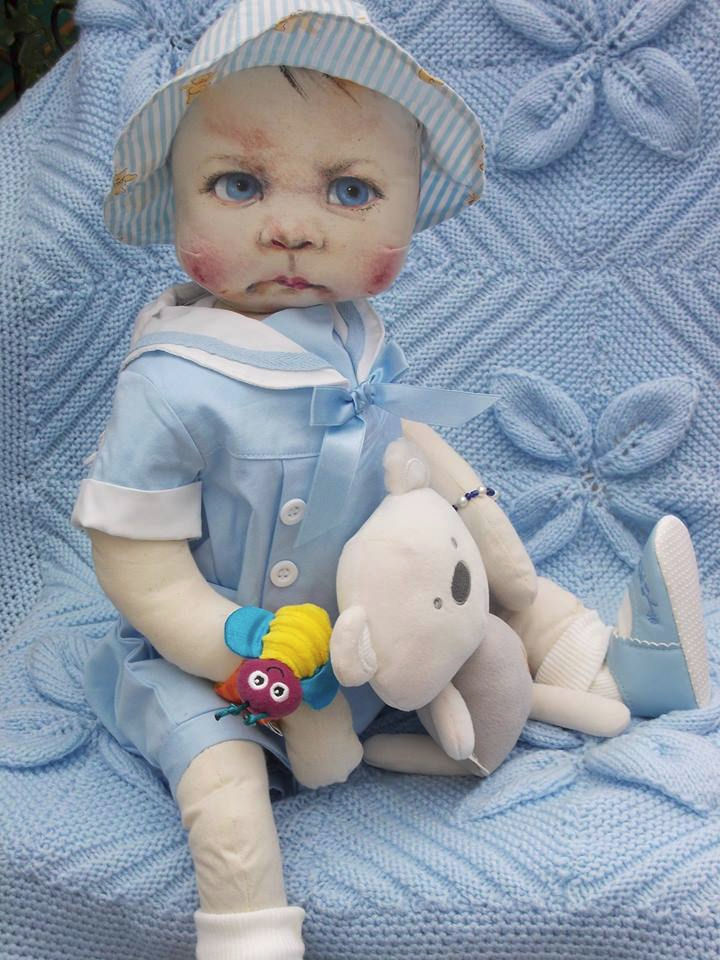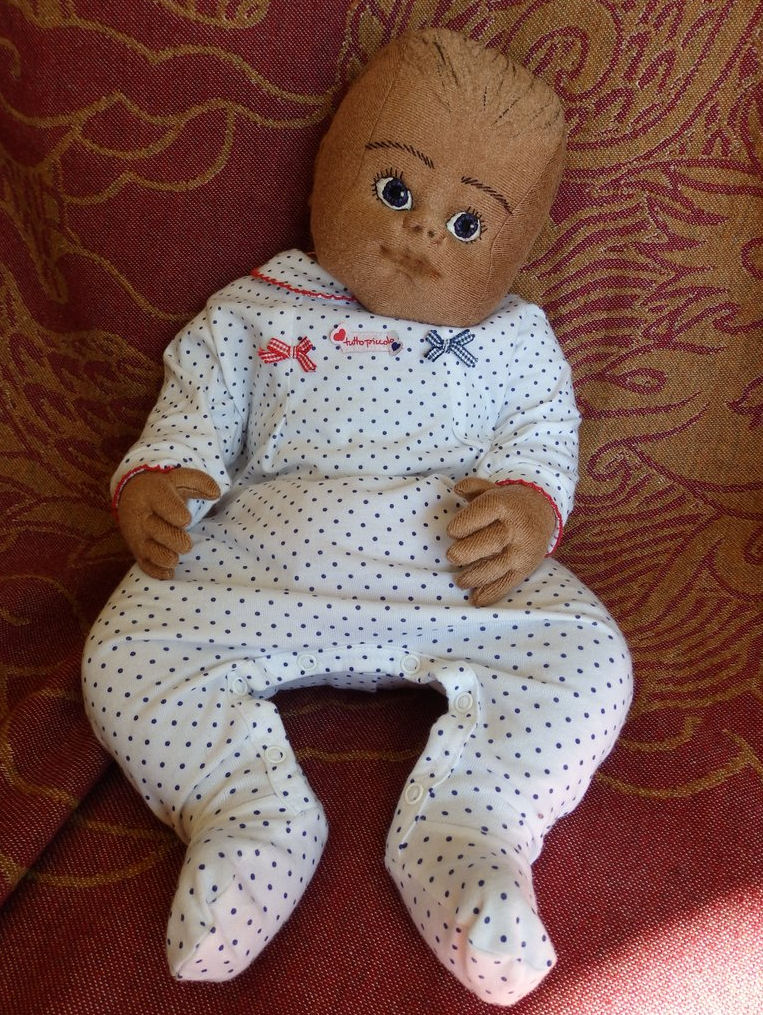 He is about 20cm tall . All natural materials. Soft cotton interlock body, pure wool stuffing, Mohair hair. Cotton embroidered face. Knitting Cotton clothing. These are my own patterns for both baby doll and clothing.