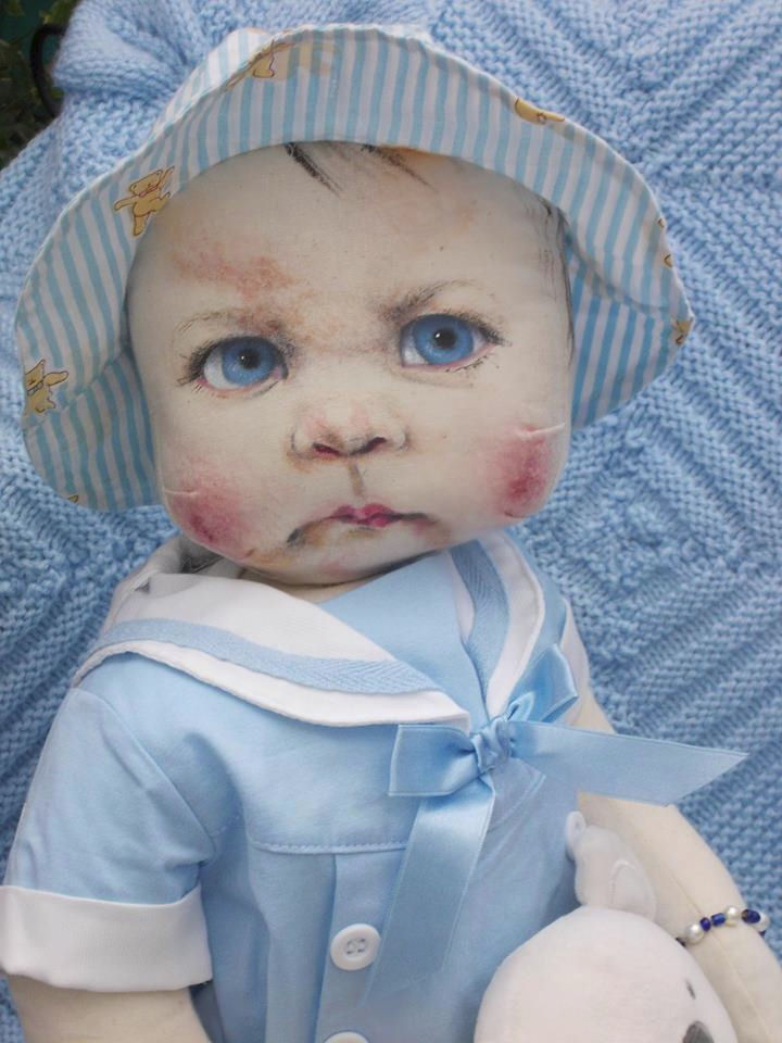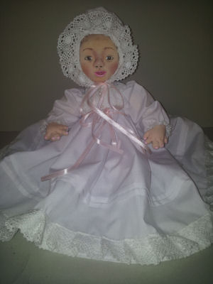 Anderson is made from medium weight unbleached calico. He is 23" in height. He is a pattern created totally from my minds eye. He is weighted with glass beads in his seat, hands and feet. He has a flat oil painted face, ears and hair. Anderson is stuffed with polyfil and looks just like my nephew when he was a baby. His clothes are shop bought and in keeping with his old world look.