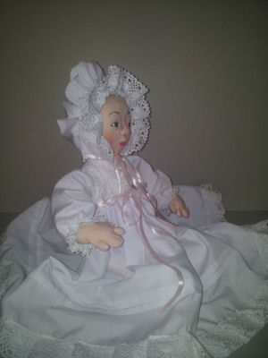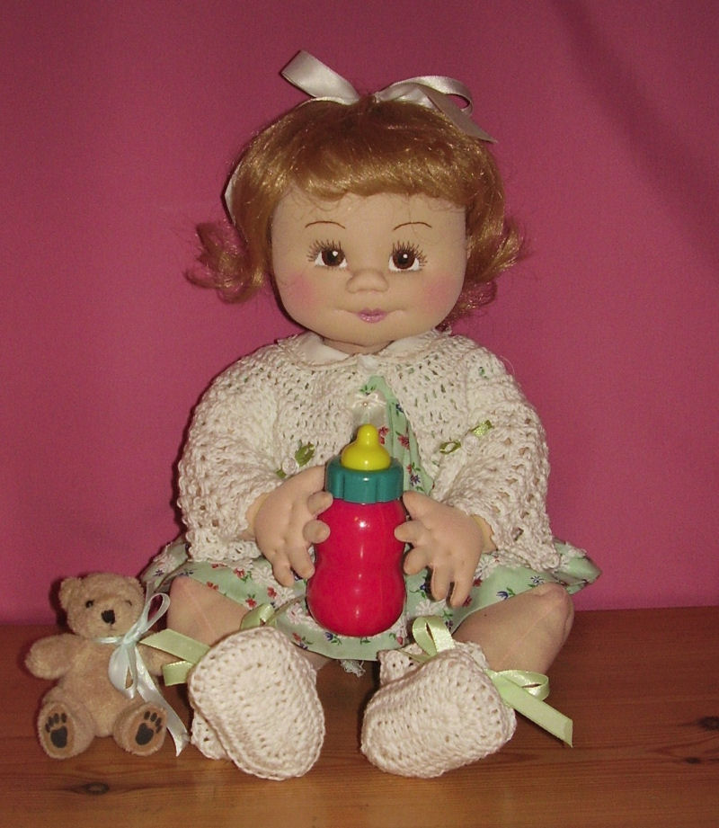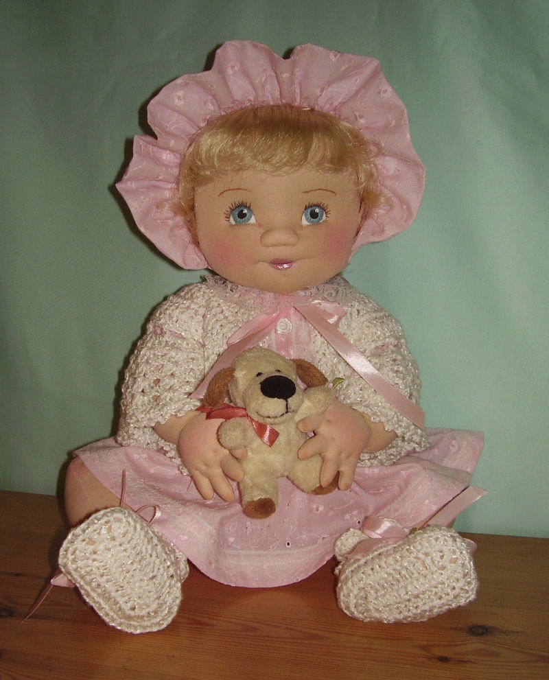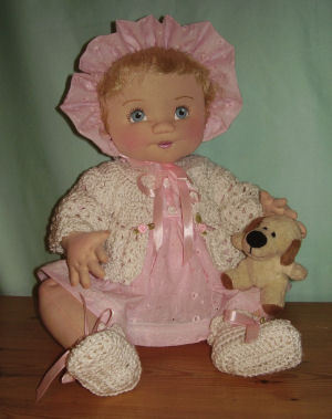I like also crocheting that's why I crocheted a white jacket and matching booties for my baby doll. Melinda is also wearing a pink dress and matching bonnet and panties from the eyelet batiste fabric. They ere all sewn by me. Melinda loves to play with her little dog and teddy bear. The toys are purchased.