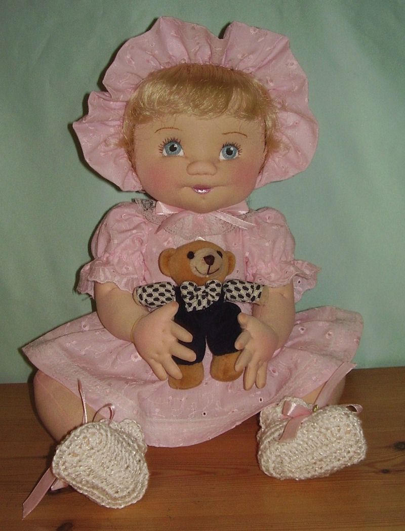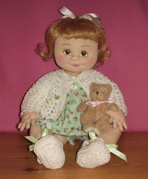 This 9 month old baby doll is created from the pattern- Annie- designed by Rainie Crawford in 1977. She measures approx. 10". I used stretchy doll fabric for the sewn doll pieces, and I painted the face with acrylic paints. I used fake fur fabric and the designer's pattern for her wig. I used a little blush just for her cheeks. The clothes and shoes were made also by me, from Rainie's pattern. The little, 1 3/4", crocheted bear prop, I made from my own pattern. Only the doll socks were purchased.