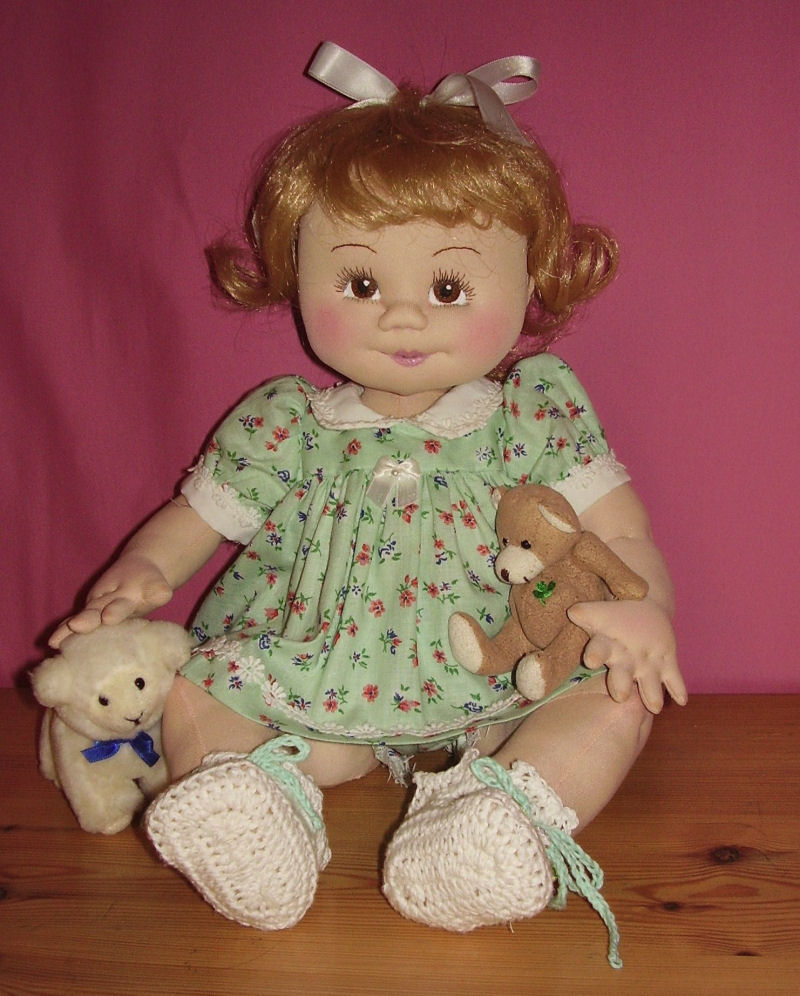 This is my baby doll Melinda. I made her by Darlene Rausch's excellent Bonnie doll pattern. The pattern was in Soft Dolls and Animals September 2009 issue. Melinda is about 18 inches tall. She can sit by herself,